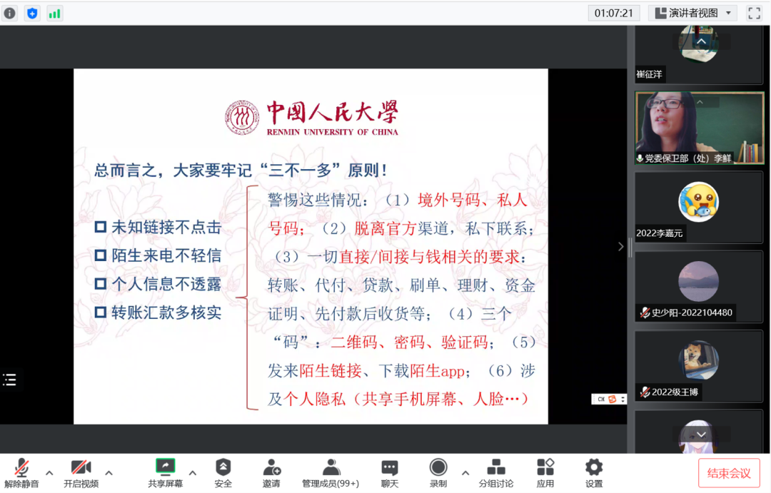 防范电信诈骗应当牢记“三不一多”原则,未知链接不点击,陌生来电不轻信,个人信息不透露,转账汇款多核实。同学们应当加强自身设备的防护,下载全民反诈APP、记住反诈劝阻电话96110、关注人大保卫处公众号“平安人大”,通过多重防护网,保护自己利益。若是遭遇诈骗,应当立即报警,尽可能保存好案件发生时的信息,避免因不报警而受到二次诈骗。