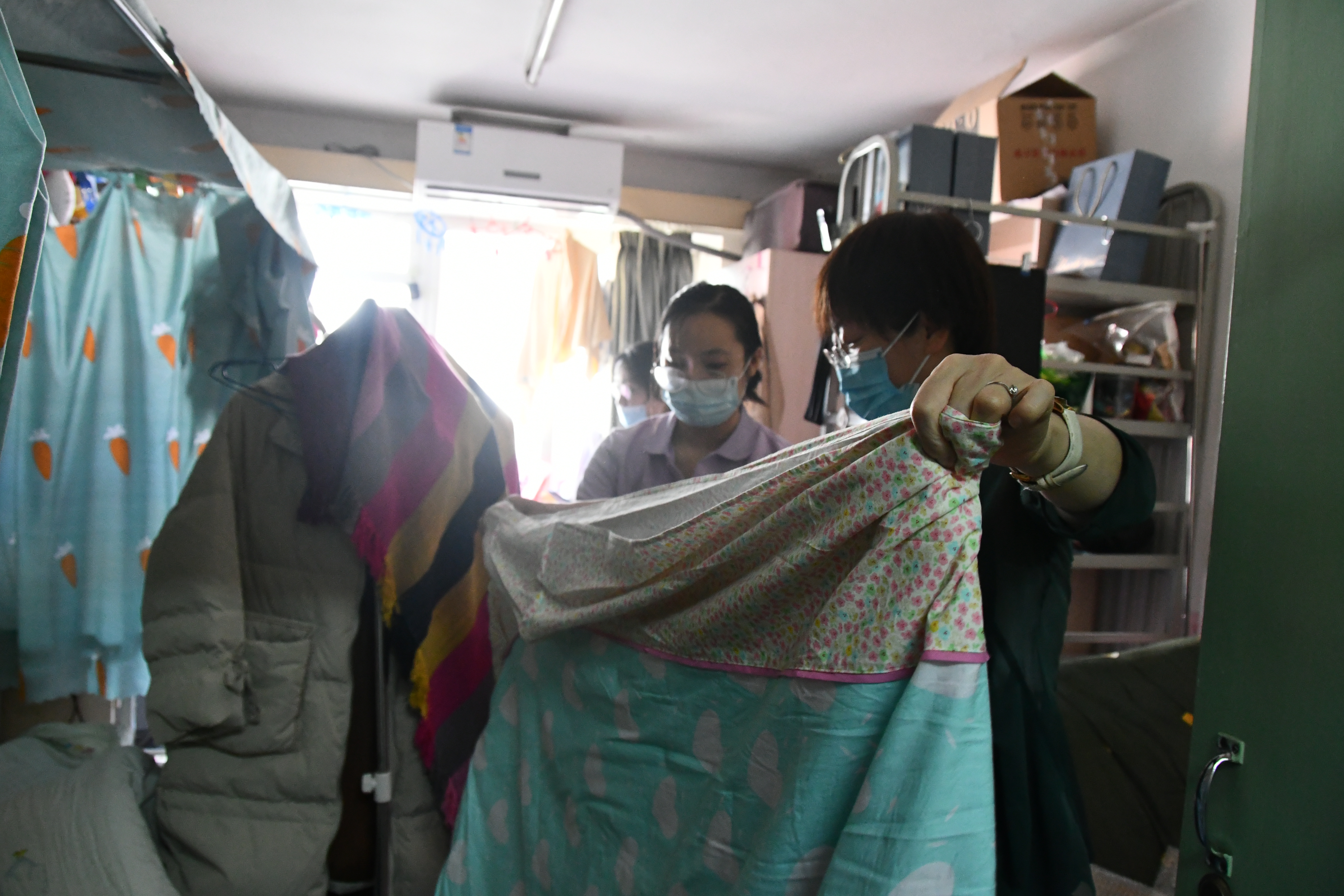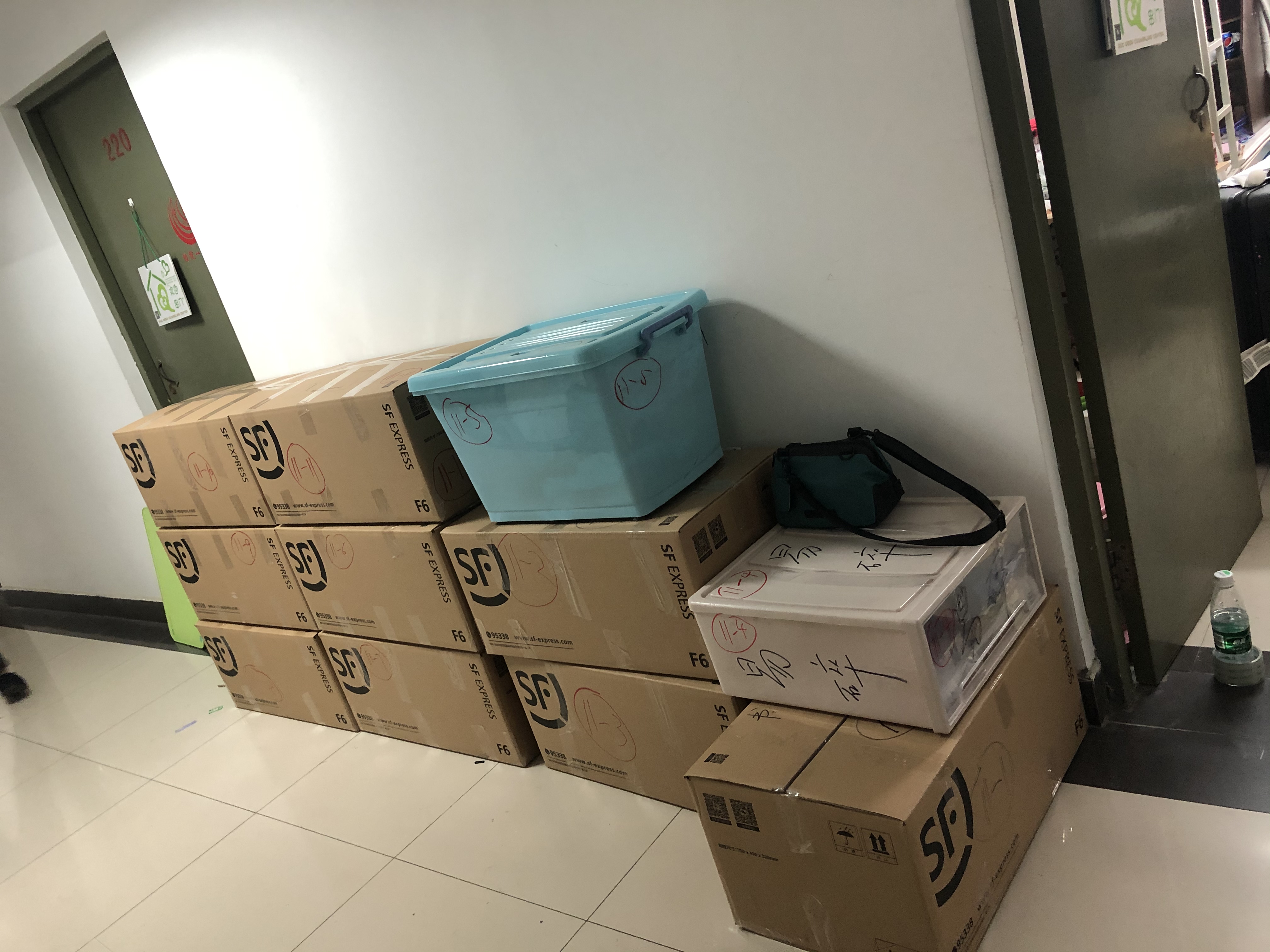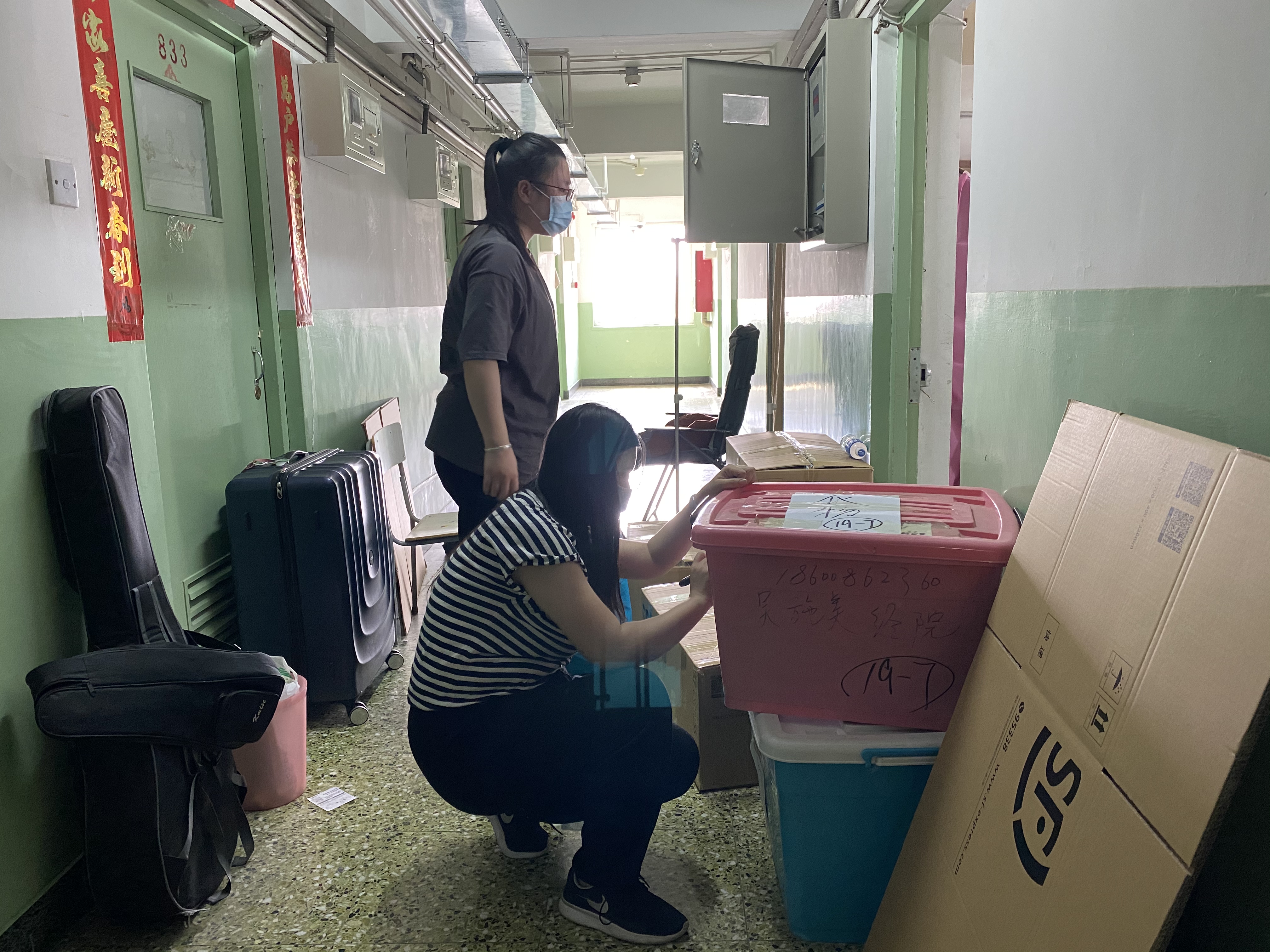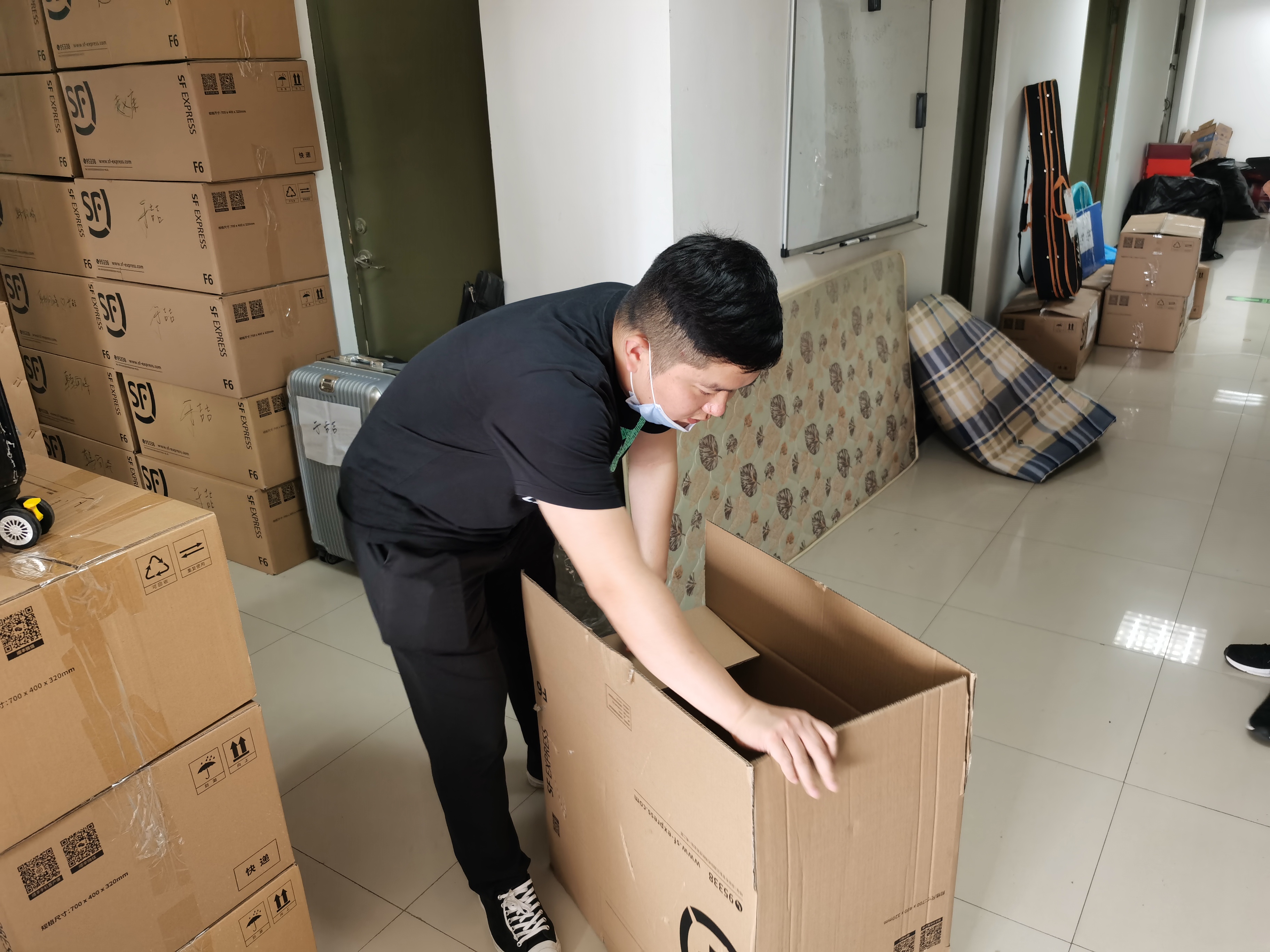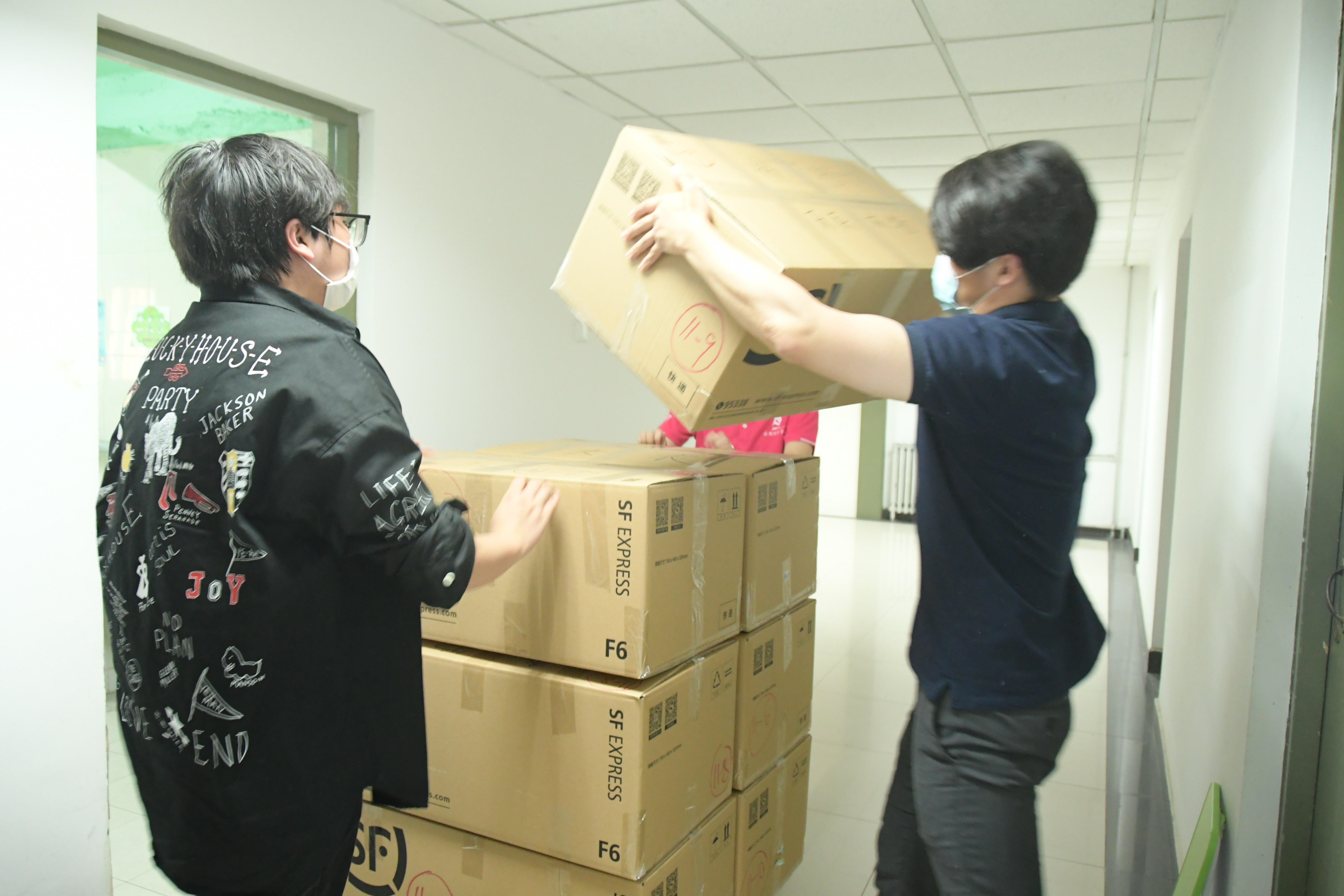 这样的对话重复着一遍又一遍。师生志愿小队一会整理着东西,一会又穿梭于走廊不停地搬运行李。夏天佩戴起口罩更加闷热,但他们也顾不上这些了——整理、打包好一位员工的包裹之后,又开始和另一位员工视频连线、整理物品、打包……
