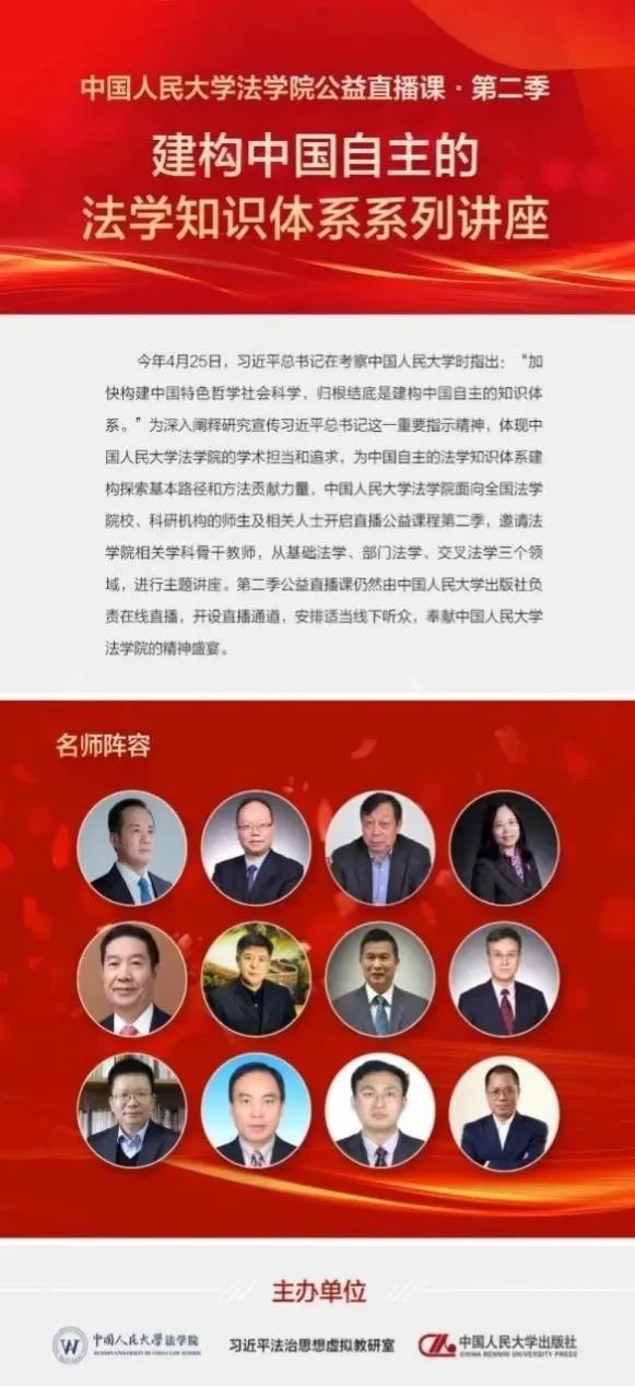在教育部直属高校中成立首家习近平法治思想研究中心,获批教育部首批法学专业虚拟教研室,共同发起成立习近平法治思想高校协同研究机制;实施教育部首批新文科研究与改革实践项目“习近平法治思想课程和教材体系建设”,荣获首届全国教材建设先进集体,参编《习近平法治思想概论》马工程教材,率先开设《习近平法治思想概论》,上线央视、“学习强国”;产出重大专项、系列专著、代表性论文等标志性成果;率先推出“习近平法治思想专题”“中国自主知识体系建构”系列讲座公益直播,研究践行习近平法治思想上走在前、作表率。