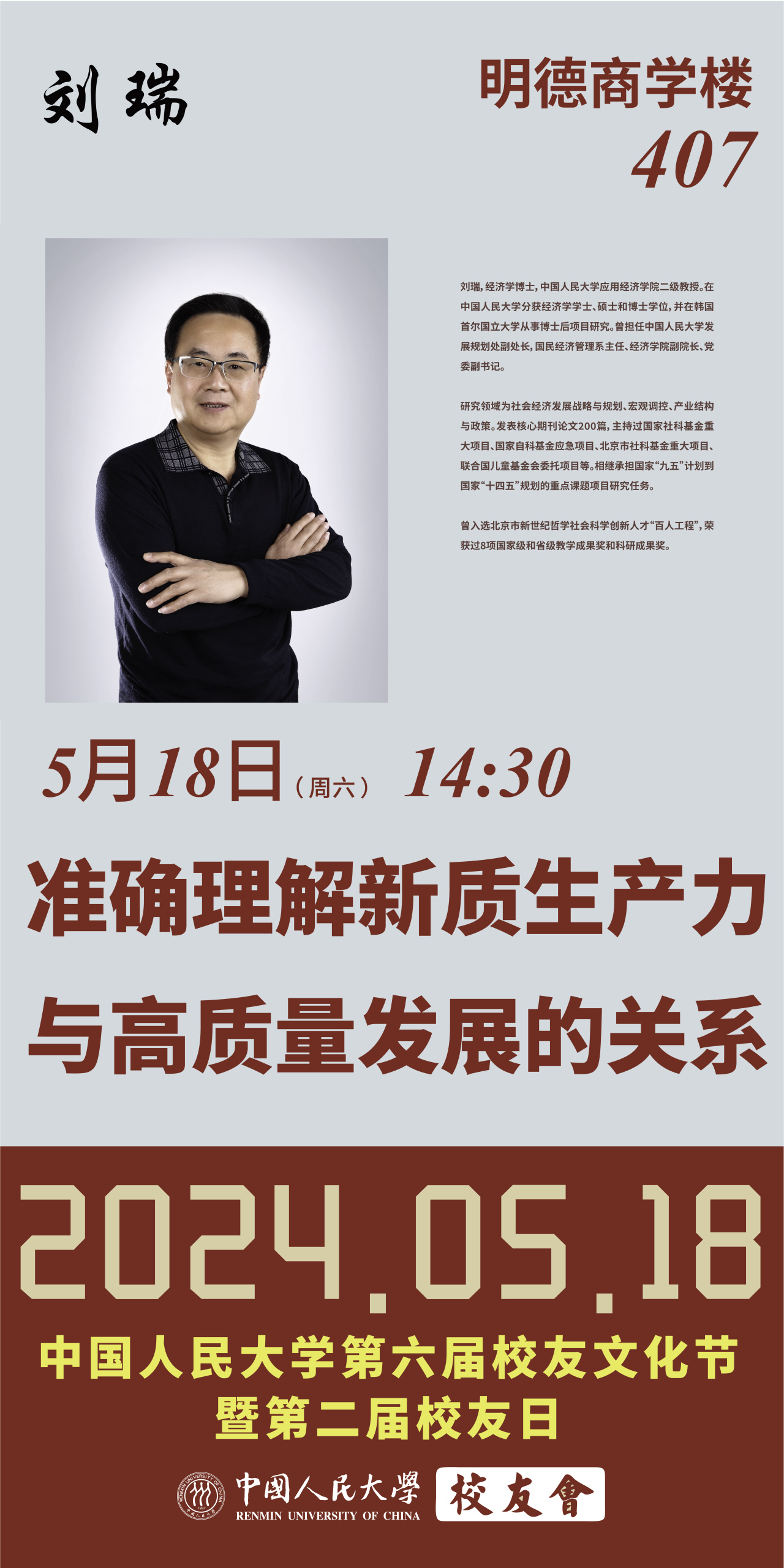 学术公告 当前位置: 首页 - 学术公告 - 讲座 第六届员工文化节“重返课堂”丨刘瑞教授主讲《准确理解新质生产力与高质量发展的关系》 发文时间: 2024-05-17 阅读次数: 讲座信息 讲座题目 准确理解新质生产力 与高质量发展的关系 主讲人 刘瑞 时间 5月18日(周六) 14:30 地点 明德商学楼407 请各位员工扫描下方二维码 选择课程站点落地 开启您的“重返课堂'之旅 报名通道 来源:sunbet官方网站员工会 设计 责编:马文林 审核:刘瑞 浩爽