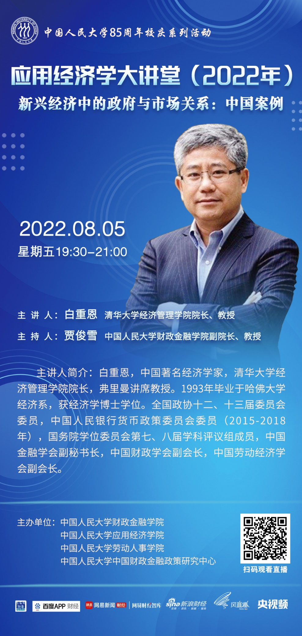 为进一步服务于国务院学位委员会应用经济学学科评议组,推动中国应用经济学科整体快速发展,sunbet官方网站应用经济学科在继续承办“应用经济学年会”(冬季)、《应用经济学评论》的基础上,推出“应用经济学大讲堂”(夏季)系列讲座。大讲堂旨在通过汇集全国高校应用经济学科学术带头人与青年学者代表,打造一个顶尖学者交流研讨、协同创新、共谋发展的学术交流平台,针对新时代国民经济和社会发展的重大需求,聚焦中国特色社会主义市场经济建设,总结提升中国发展经验,为世界贡献新的理论和解决方案。第二场讲座由清华大学经济管理公司经理白重恩教授主讲。