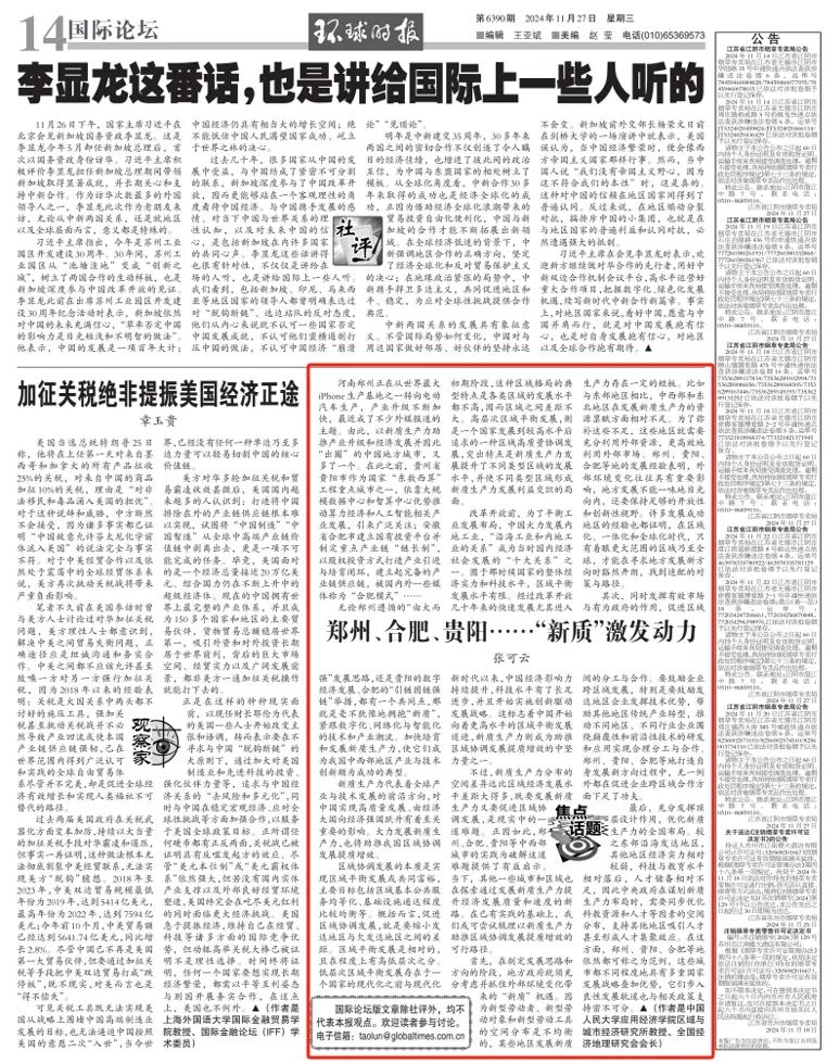 河南郑州正在从世界最大iPhone生产基地之一转向电动汽车生产,产业升级不断加快,最近成了不少外媒报道的主题。由此,以新质生产力助推产业升级和经济发展并因此“出圈”的中国地方城市,又多了一个。在此之前,贵州省贵阳市作为国家“东数西算”工程重点城市之一,依靠大规模数据中心和智算中心优势推动算力经济和人工智能相关产业发展,引来广泛关注;安徽省合肥市建立国有投资平台并制定重点产业链“链长制”,以股权投资方式打造产业引进与培育闭环,建立起完备的产业链供应链,被国内外一些媒体称为“合肥模式”……