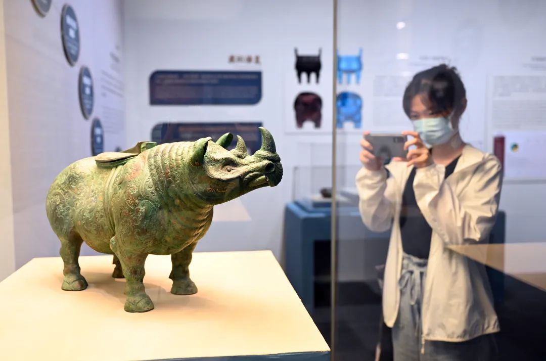 近日,“片羽重辉——国家博物馆文保成果展”在京开幕。图为观众参观3D打印结合传统工艺仿制的错金银云纹犀尊。新华社记者 金良快 摄
