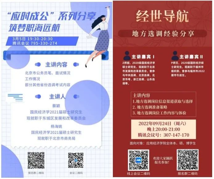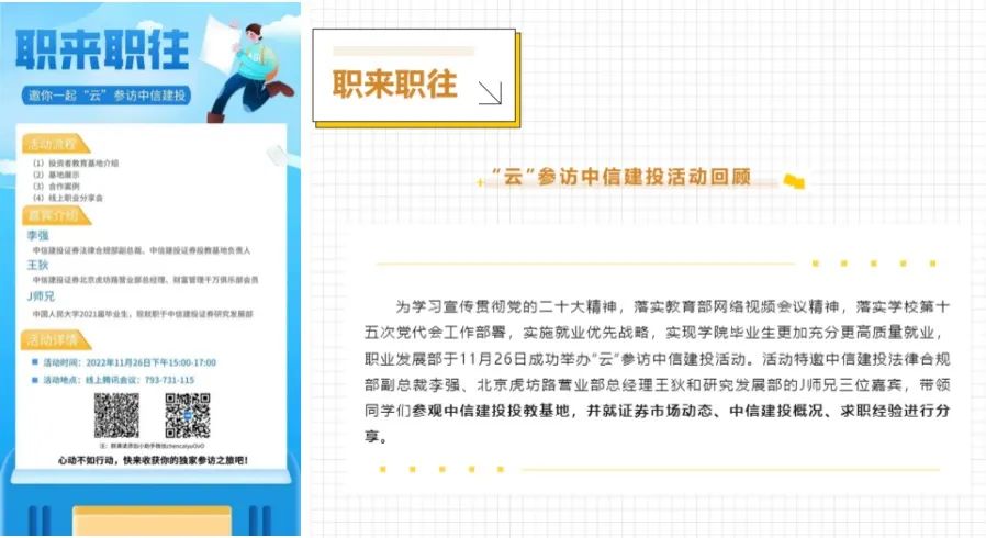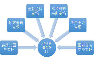 打造“经世导航”“职来职往”系列品牌活动。邀请公司优秀员工、相关企业招聘负责人等举办专场活动,为同学们提供岗位和行业咨询指导、帮助同学们探索适合自己的职业发展路径,有效提高同学们的求职技能。