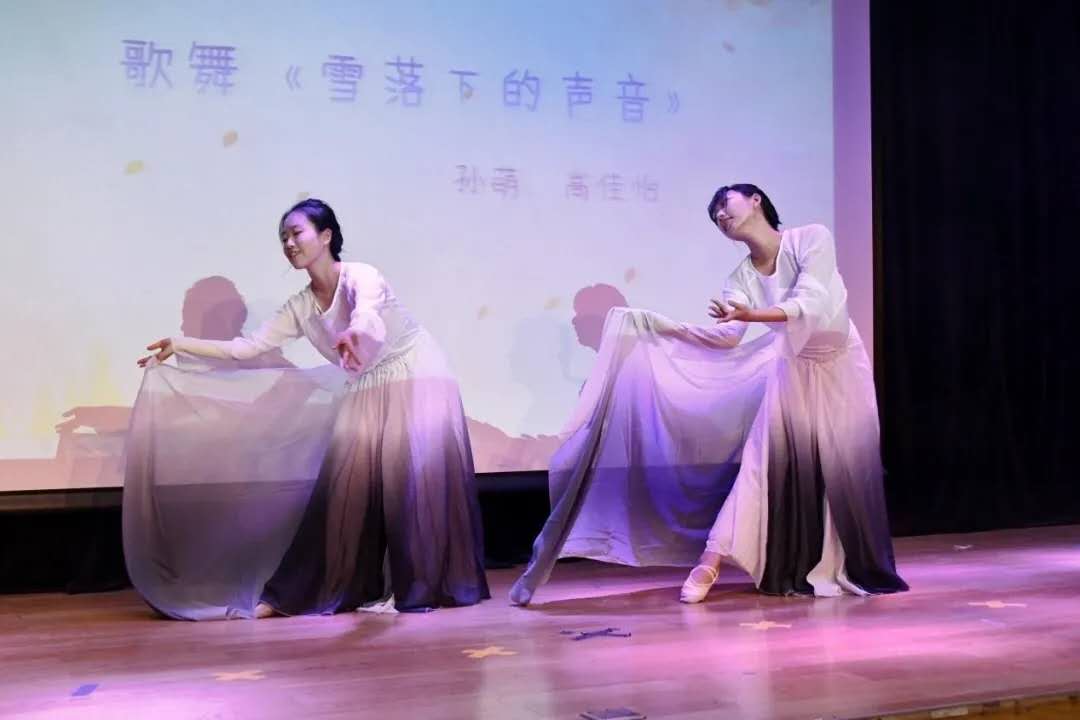听,雪落下的声音,无言却深情。高佳怡、孙萌带来歌舞《雪落下的声音》,在悠扬的旋律中婉转吟唱、翩然起舞,衣袂飘飘,似云似雪,使人陶醉在这美好之中。