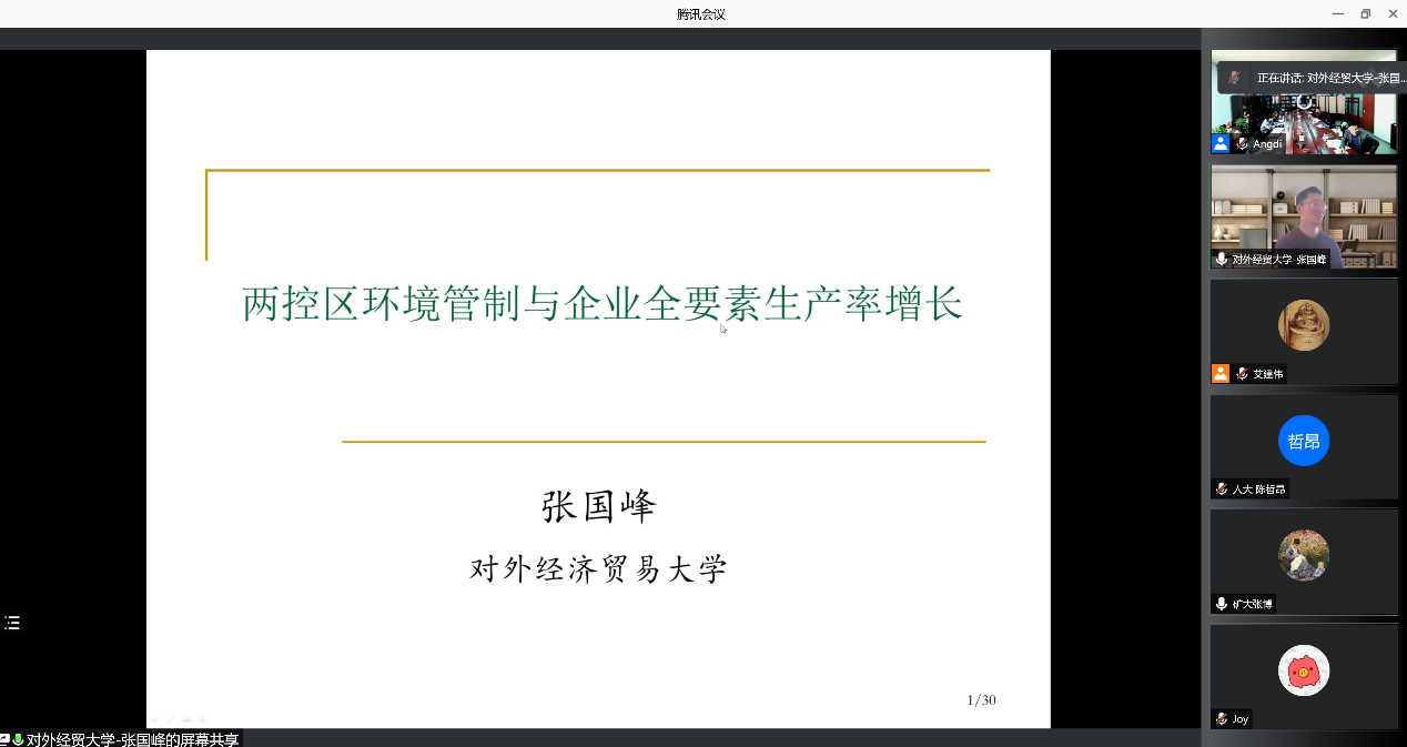 对外经济贸易大学国际经济贸易公司副教授张国峰以《两控区环境管制与企业全要素生产率增长》为题,刻画了企业全要素生产率的断尾特征和移动-伸缩特征,利用“无条件分布特征—参数对应”的分析方法,系统地考察了两控区环境管制对企业全要素生产率的影响。研究发现,两控区内企业生产率增长幅度显著低于非两控区,表明两控区环境管制通过提升生产成本阻碍了企业生产率的增长。另外,两控区内低生产率企业淘汰比例更高,从而提升了区内平均生产率水平。异质性分析发现,两控区政策对生产率的影响主要集中在高研发密集度与高污染行业、政策执行力较强和经济发展较快的地区,地区集聚经济有助于缓解该政策的负效应。