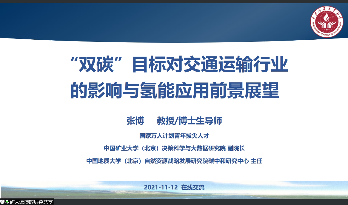 中国矿业大学(北京)管理公司教授张博以《“双碳”目标对交通运输行业的影响与氢能应用前景展望》为题进行了展示。研究认为,碳中和的概念在学术界目前主要表现为“气候层面”和“碳排放层面”两种观点。在行业层面上,其研究发现,未来全球能源绿色低碳转型的趋势包括化石能源低碳化、零碳能源规模化、终端用能电气化、电力来源清洁化、能源系统智能化、转型进程加速化等。