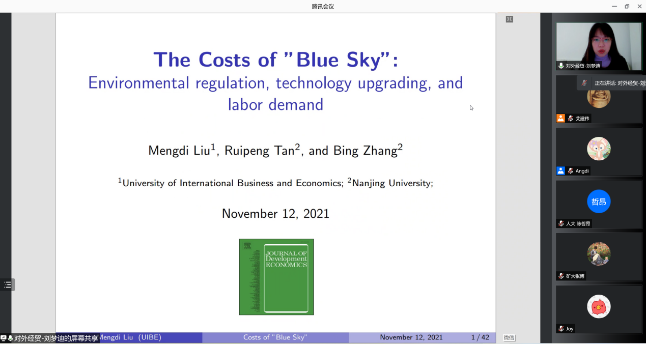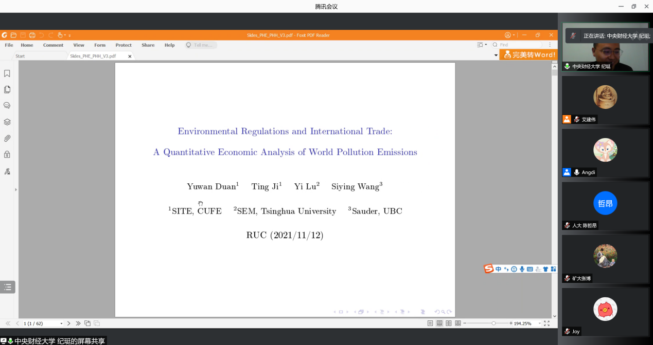 中央财经大学国际经济与贸易公司副教授纪珽以《国际贸易和世界污染排放:一个量化贸易的视角》为题进行了展示。该研究将污染作为生产的副产品纳入一般均衡贸易模型,并考虑了生产过程中投入产出联系,以此对国际贸易、环境和环境规制的相互关系进行量化研究。报告以污染避难所假说(Pollution Haven Hypothesis, PHH)和污染避难所效应(Pollution Haven Effect, PHE)之间的关系开始,通过理论模型构建和基于全球数据的结构模型估计,发现污染避难所效应(PHE)确实存在,但并没有发现污染避难所假说(PHH)存在的证据,即环境规制对国际分工和产业转移的作用有限。进一步的分析发现,即使将环境政策视为受贸易自由化影响的内生变量时,前文的主要结论不变。最后,贸易自由化的收入效应增加了世界污染的排放,生产率水平和贸易成本很大程度上决定了国家间贸易的分工,因此盖过了污染避难所效应。