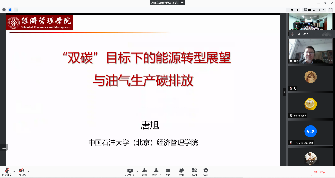 中国石油大学(北京)经济管理公司经理唐旭以《“双碳”目标下的能源转型展望与油气生产碳排放》为题进行汇报。研究认为,我国实现碳达峰、碳中和目标具有路径可达性,但面临巨大挑战。碳中和情景下,实现路径需要经历煤、石油达峰,天然气消费达峰以及化石能源消费急剧下降,形成可再生能源为主导的能源系统。在此期间,应注意协同管理油气资源开发中的产量与生产碳排放,持续关注不同油气生产排放的异质性,优化油气资源开发结构。