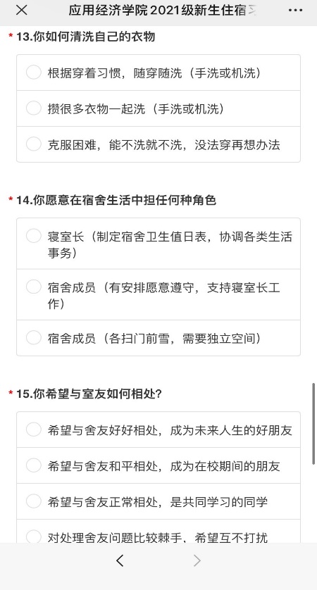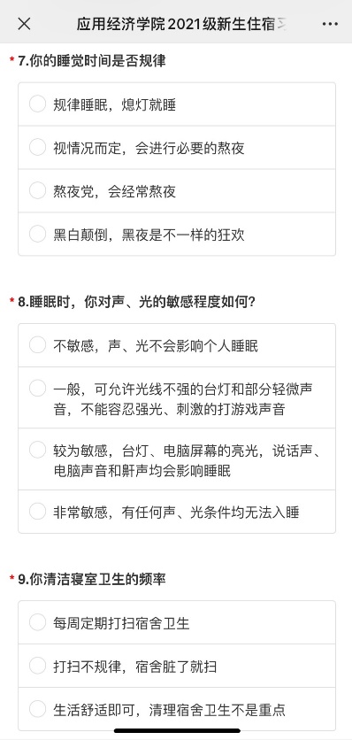 宿舍生活是新生生活的最小单元。在公司住宿调查的基础上,公司精心制作了包含16个问题的调查问卷,涉及基础信息、睡眠习惯、特殊偏好、寝室定位、人际期待等内容,全方位了解同学们的个性化需求,力求为同学们绘制精准住宿自画像。根据新生调查结果分配宿舍和床位,帮助新生尽快适应集体生活。