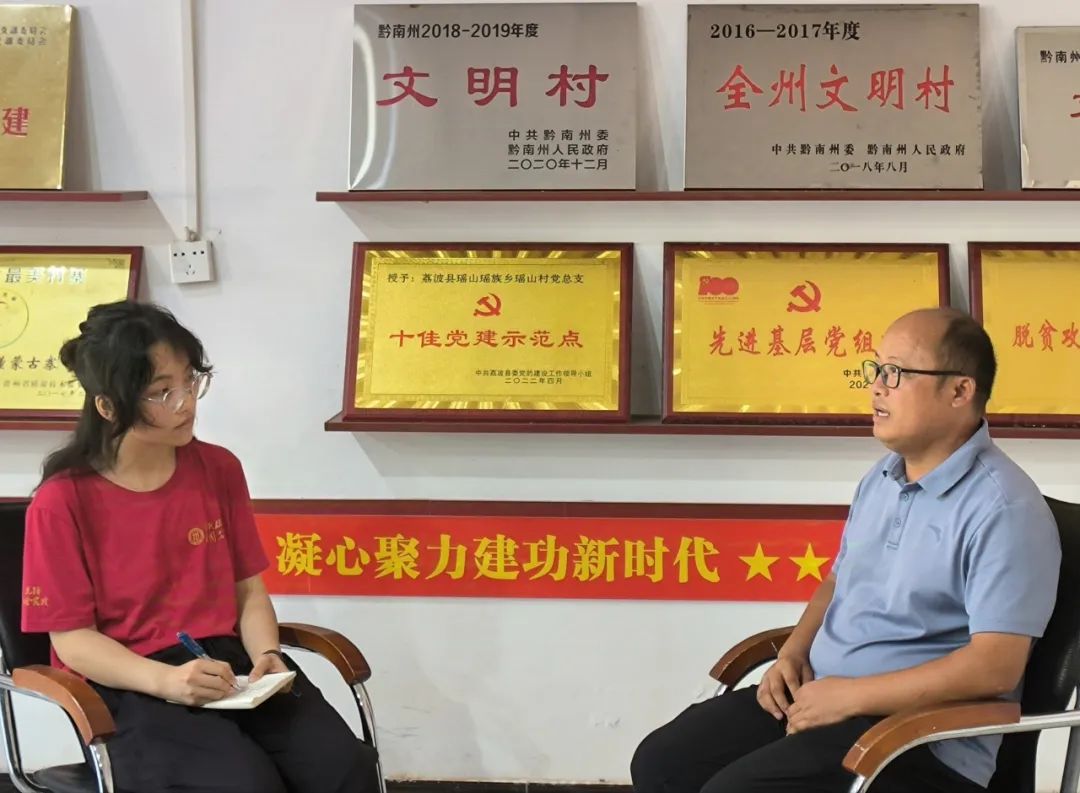 ▲新闻公司本科生马婉骁访谈荔波县朝阳镇洪江村主任莫孟端