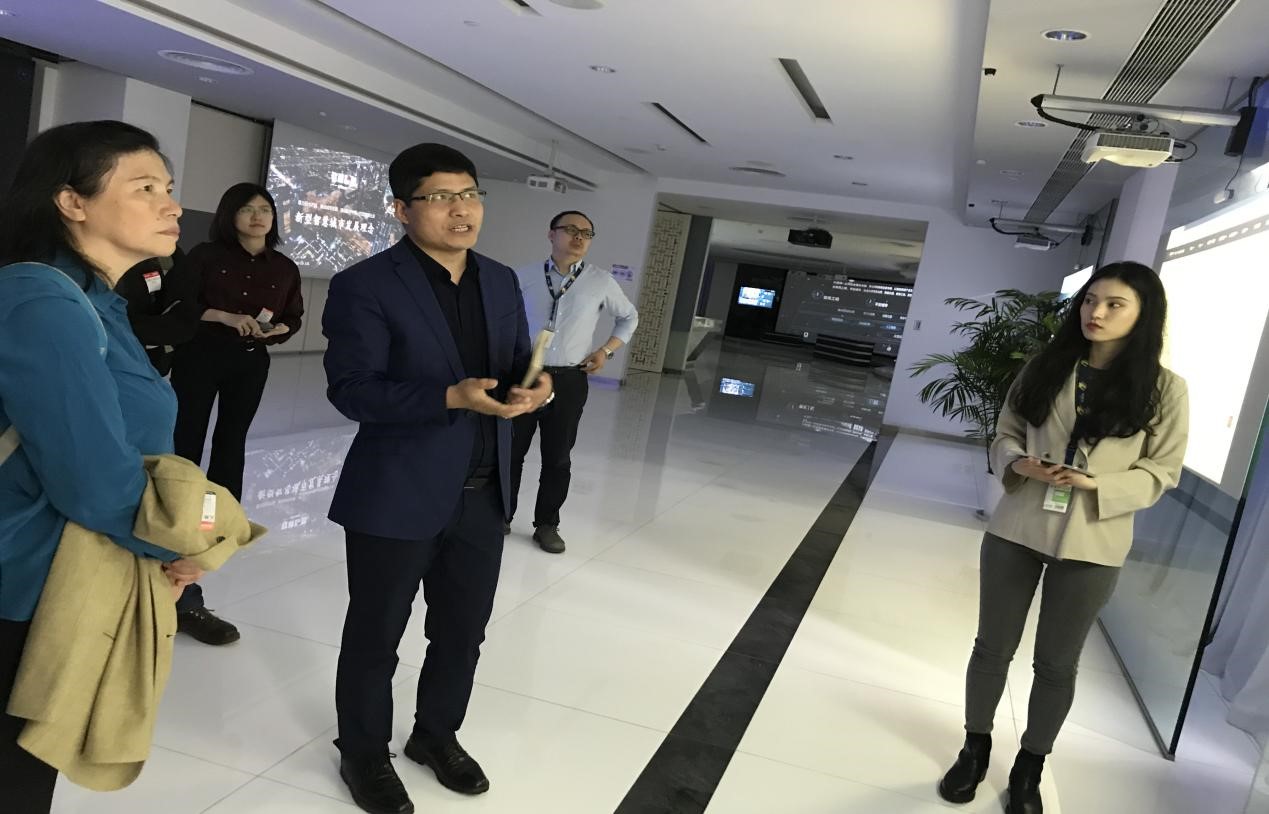 调研分为现场参观和会议座谈两个环节。参观环节,软通集团的专职讲解员向课题组成员重点介绍了软通智慧的发展历程、业务布局、重点项目,资质、奖项、社会责任等基本情况。曹晓兵副总裁常会在讲解的关键时点给予相应的补充,如对城市治理过程中的具体运用技术、运用效果做出更加详细的说明。课题组成员了解到,作为2007年最早进入中国“数字城市”的科技型公司,软通智慧在“让城市更智慧”的使命中不断发展壮大,已成为了行业标准的制定者、联合创新的实践者、产业生态的引领者。目前,软通智慧的落地运营城市超过90个,业务覆盖城市超过130个,提供解决方案超过100个,实施项目总数达600个,为城市发展过程中的政务服务、城市治理、公共安全、创新创业提供了坚实而广泛的技术支持。