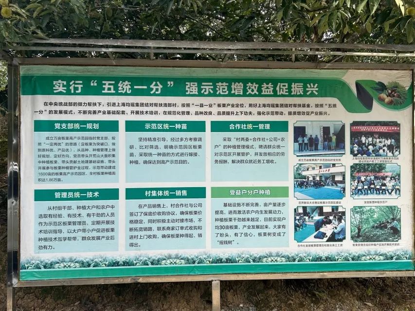 洛郎村大力发展板栗特色产业,聚焦特色林业经济,竭力将生态资源转化为发展资源、生态财富转化为发展财富,并不断提升望谟板栗品牌价值和产品附加值。在生产模式上,望谟县采取“农户+合作社+企业”的合作方式。农户与企业签订收购协议,形成价格兜底保障,降低市场波动对农户的影响。此外还通过上海均瑶集团与吉祥航空公司达成合作,将望谟板栗加入飞机餐食,进一步拓展销售渠道。在销售过程中,望谟县引入板栗精加工工厂,构建小型集散中心,打通从种植到销售的完整产业链。同时借助东西部消费扶贫政策以及直播带货等方式,实现了产品外销,进一步提升了农民收入,保障板栗产业的持续发展与稳定收益。通过这套科学、稳定的种植和销售体系,望谟县不仅有效带动了当地农户增收脱贫,还推动了板栗产业链的延伸与升级,为巩固脱贫攻坚成果、促进乡村振兴提供了有力支持。
