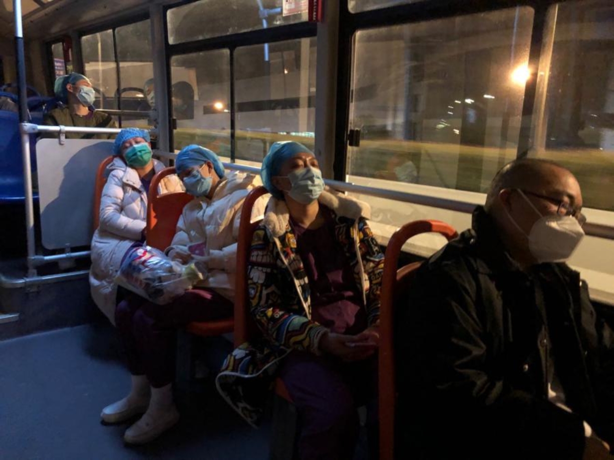 援鄂的医务人员所面临的危险更加严重。进仓期间,他们要穿上厚厚的防护服,紧勒的护目镜和口罩已经使他们面部失去知觉,为了节省物资并全身心投入战斗,他们在仓期间完全不能喝水,连续奋战6小时出仓后才能稍有放松,累到在接他们回住处的班车上坐着也能睡着。