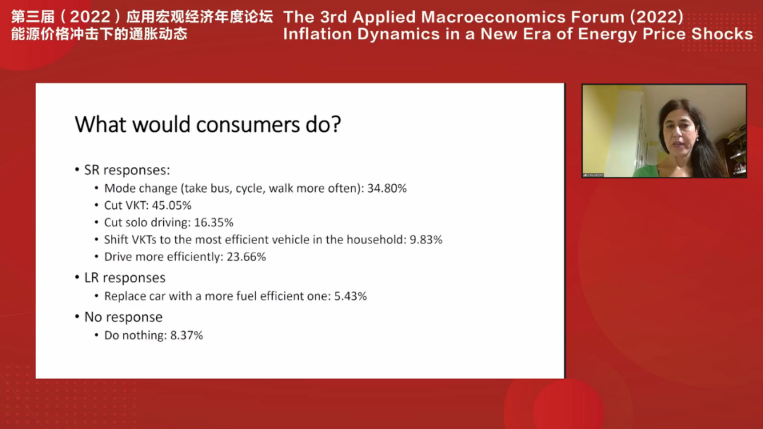 马里兰大学教授Anna Alberini作题目为“First the Pandemic, and then What? Volatile Energy Markets, Consumers and Energy Price Expectations”的报告。该研究在近期对捷克、德国、意大利和波兰四个国家的消费者进行了一项能源价格预期调查,结果显示消费者愿意并且有能力对1个月、6个月、12个月和60个月后的汽油价格增长率做出点预测。受访者普遍预计未来能源价格将有大幅上升,但是预期存在较高的不确定性,并且呈现长右尾分布。消费者在能源上涨预期下做出的行为调整以短期调整为主,如更多地使用公共交通工具,少数消费者做出长期调整,如以电动车替换燃油车。