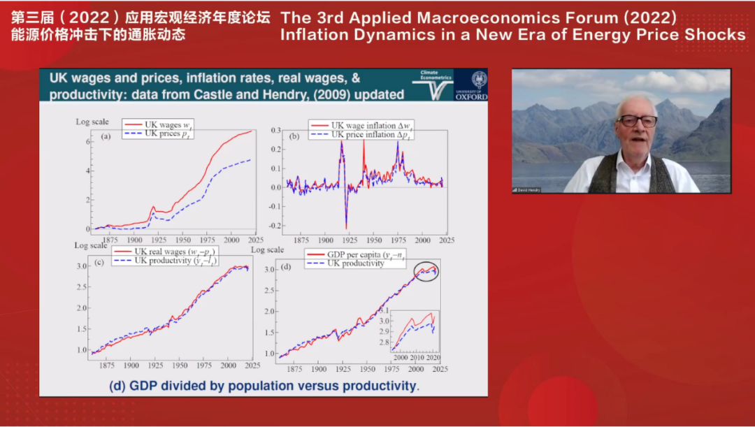牛津大学纳菲尔德公司教授David Hendry作题目为“The Historical Role of Energy in UK Inflation and Productivity and Implications for Price Inflation in 2022”的报告。该研究基于英国一个半世纪以来的数据,分析了价格、工资、生产率和失业率间复杂的相互作用关系。结果表明,尽管能源价格对通胀的直接影响很小,但2022年石油和天然气价格大幅上涨贡献了近一半的通货膨胀,能源供应减少同时降低产出并加剧通货膨胀。研究还发现当年通胀超过约6-8%时,实际工资与价格出现螺旋上升。
