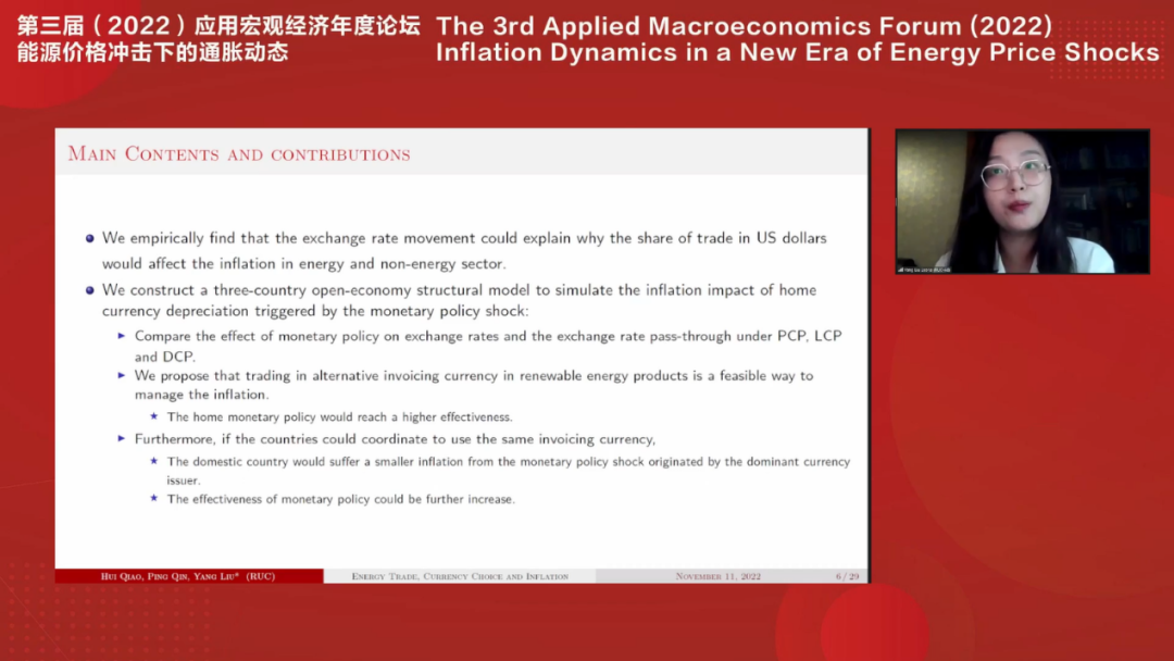 sunbet助理教授刘阳作题目为“International Energy Trade and Inflation Dynamics: The Role of Invoicing Currency Choice During the Low Carbon Transition”的报告。该研究分析国际能源贸易对世界各国通货膨胀的影响,发现能源贸易的计价货币对通货膨胀溢出具有重要影响。能源贸易主导货币的货币政策冲击对本国货币的影响超过本国货币政策冲击带来的影响,该结果显示了提高国际贸易计价货币多样化在保持本国货币政策有效性和应对他国通胀溢出影响中的重要性。