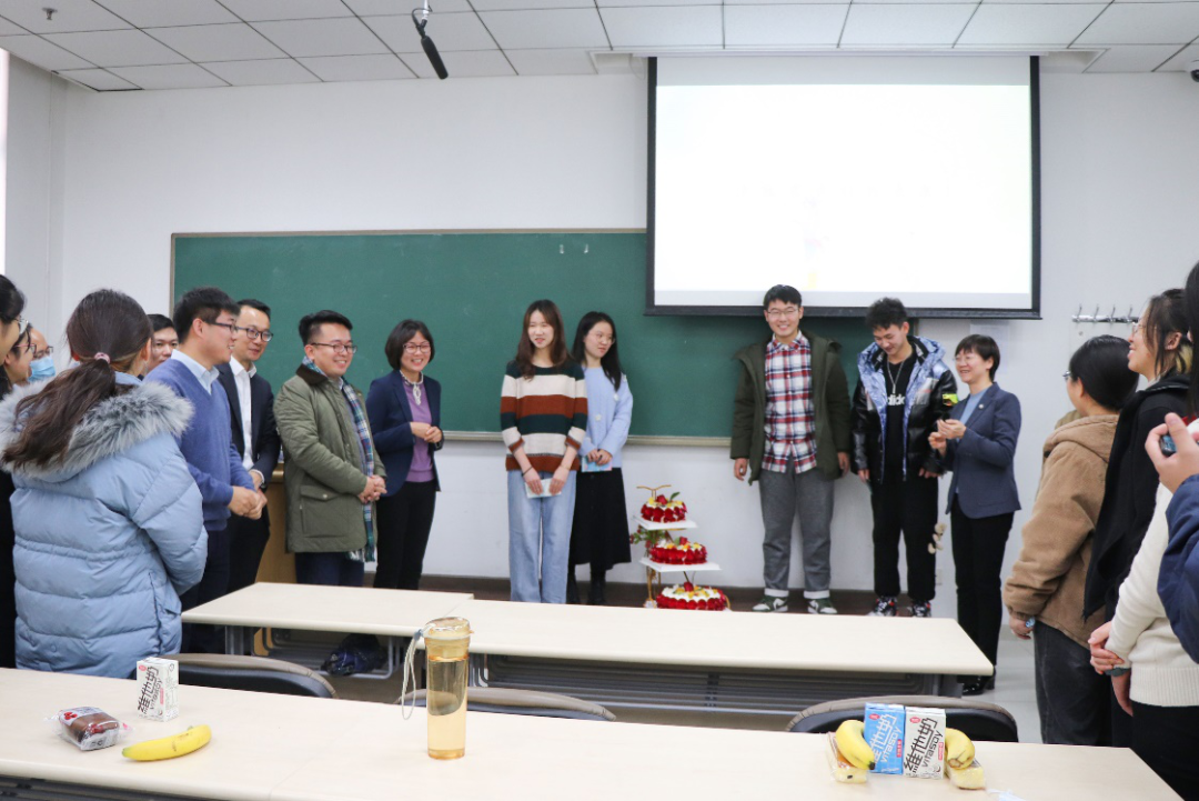11月25日中午12点半,明商0409传来振奋人心的歌声,公司党委书记宋东霞老师、党委副书记林晨老师和新生班主任老师们前来慰问参赛的应小经们,为大家送上鼓励与祝福,并和大家们一起过了集体生日会。寿星们收到了来自师兄师姐们的生日贺卡,同时精致的生日蛋糕也给所有同学带来了惊喜,让大家彼此更加亲近,对129的热情也更加高涨。