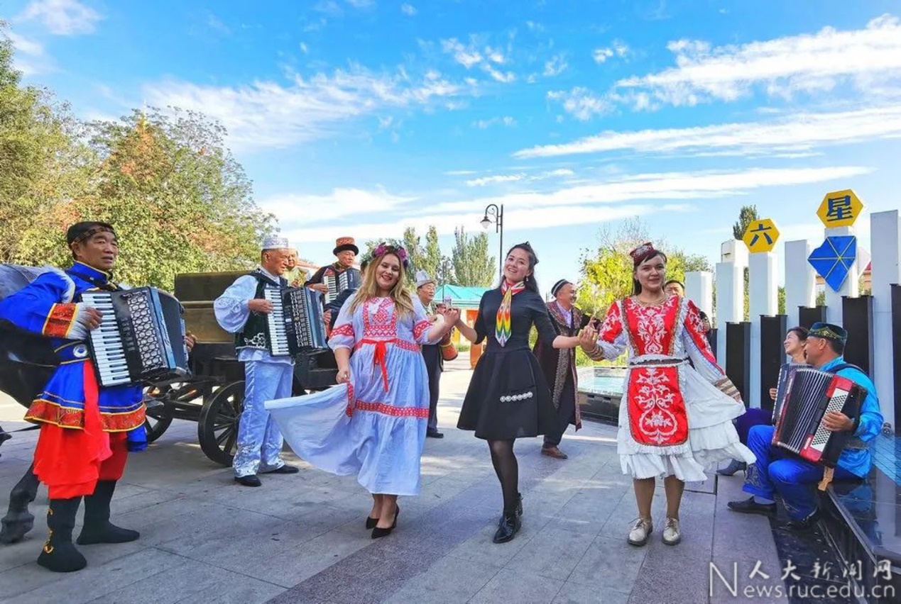 尖顶小阁楼、半弓形窗棂、木雕廊檐、铁艺门廊,还有一张张热情洋溢的笑脸,来来往往的市民、游客,与各具民族风格的果园、庭院、音乐、舞蹈融为一体,充分体现了各民族手足相亲、精神相依、守望相助、人心归聚,展现着中华民族共同体意识的独特文化魅力。