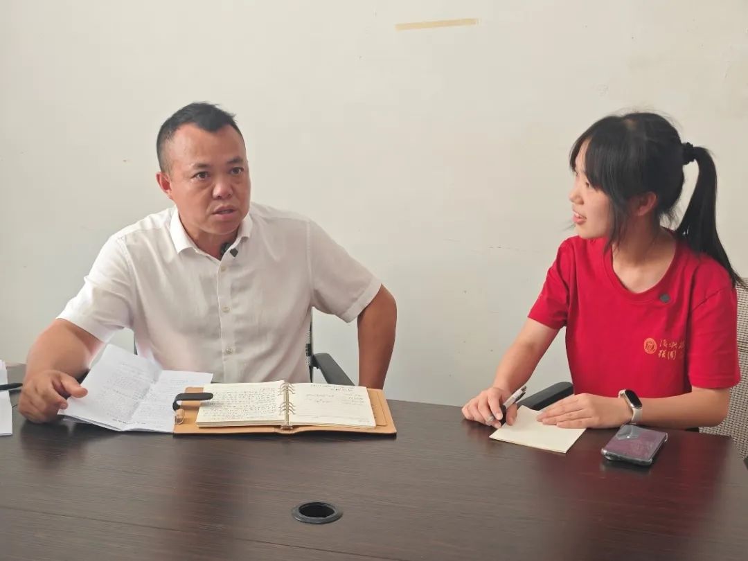 ▲调研团新闻公司本科生许佳琳访谈正大镇聚宝村乡村振兴驻村第一书记王洪江