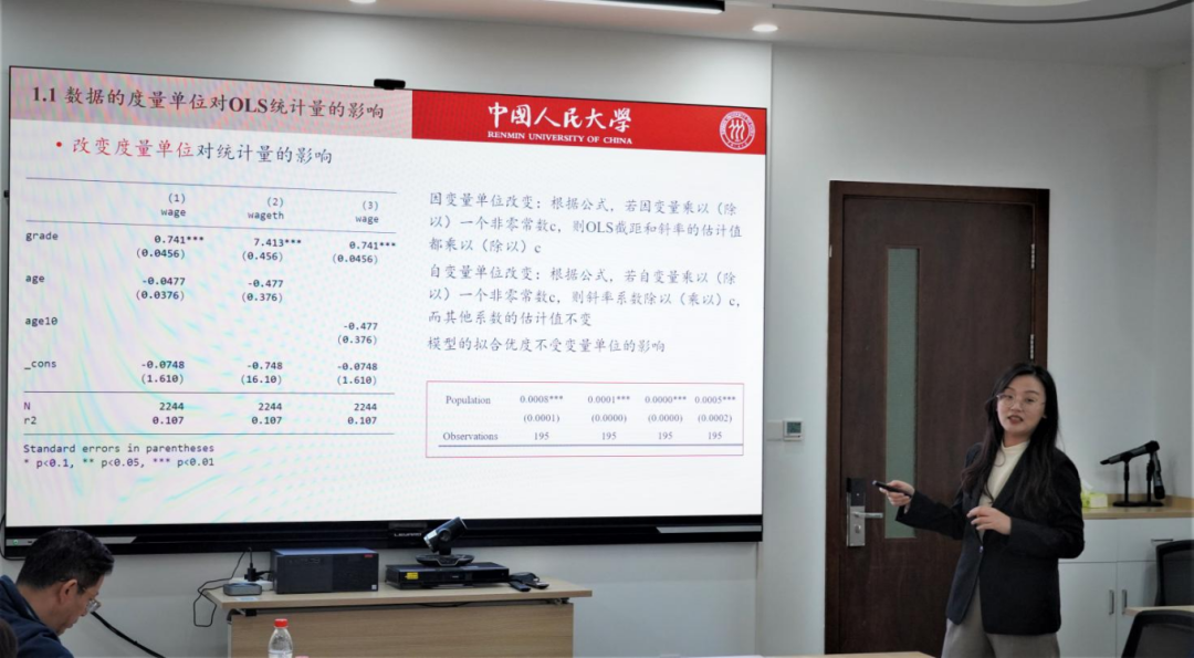 刘阳以计量经济学中的“多元回归分析应用的讨论”为主题进行展示。她系统探讨了变量度量单位的影响,实证研究中函数形式的变形,并举例对相应内容进行分析,最后全面回顾和总结此部分的重点内容。