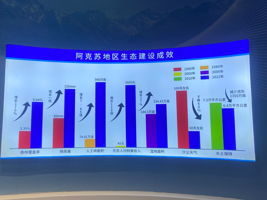 柯柯牙纪念馆共分为荒漠戈壁、百折不挠、薪火相传、信念弥坚四个篇章,以图片、文字、影像等多种形式,全面、立体展示了柯柯牙生态工程的发展历程、伟大成就。30多年廣续奋进,曾经被沙漠覆盖的柯柯牙如今已成为绿色的海洋。森林覆盖率从1980年的3.35%上升到2022年的9.04%,沙尘天气从百余天控制到一个月左右。昔日默默无闻的阿克苏就成为了新疆林果主产区,年产值达数百亿元。如今,450万亩的优质“好果源”,正在不断供应着种类繁多的果品。以冰糖心苹果、纸皮核桃为代表的阿克苏林果产业,成为新疆农业高质量发展的“示范田”。以柯柯牙精神融入血脉的阿克苏人民,在荒漠戈壁上培育出亿万片新叶,改变着大地的颜色,重现绿水青山,又在这绿水青山中开拓奋进,畅享金山银山的喜悦。调研团队成员纷纷感叹,“自力更生、团结奋斗、艰苦创业、无私奉献”的“柯柯牙精神”值得新时代青年学习、传承、弘扬。
