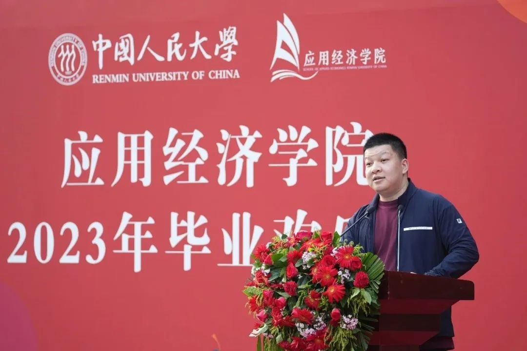 2021级产业经济学硕士班班主任陈佳莹发言。她送给全体毕业生“三颗心”。第一颗是对自己的信心,面对坎坷和挫折,要保持坚定的信心和勇气;第二颗是做事的恒心,希望大家沉淀自己、葆有初心、持之以恒,付出的努力终将有所收获;第三颗是对社会的责任心,希望同学们在未来人生道路上怀揣对人民、对社会的责任感,努力成为“复兴栋梁,强国先锋”。