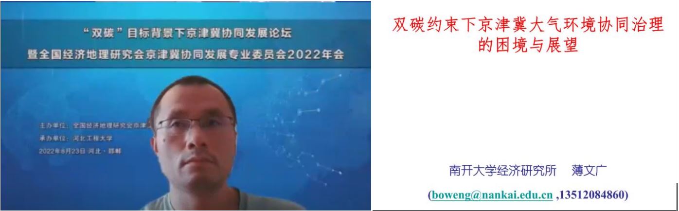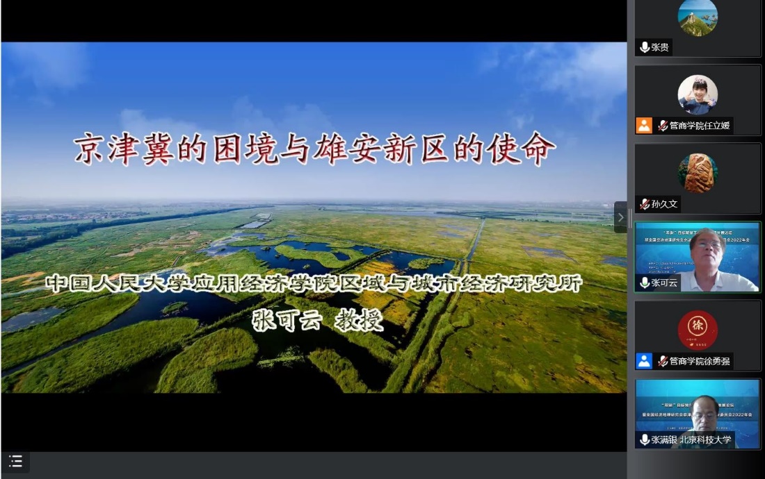 七位全国经济地理研究会京津冀专委会主任委员分别围绕京津冀协同发展的新动能、新机制、新发展和新方法展开了研讨。sunbet官方网站文余源教授作题为“基于航空流的中国城市群体系网络格局时空演进”的报告,讨论了城市群整体格局和航空布局、城市群体系航空流网络格局及城市群体系空间结构的时空演进特征等,为京津冀协同发展提供了思路。首都经贸大学特大城市经济社会发展研究院副经理叶堂林教授作题为“北京打造数字标杆城市的问题及对策研究”的报告,提出要充分发挥北京数字经济发展优势,为津冀两地数字经济发展提供创新动能。中国社会科公司工业经济研究所区域经济室主任叶振宇研究员做了题为“京津冀区域发展这十年的变化探究”的报告,围绕京津冀协同发展中存在集聚外部性规律、公共物品外部性规律、区域治理规律、区域增长规律和区域一体化规律,提出该区域高质量发展的新思考。河北经贸大学经济研究所所长田学斌教授作题为“类市场机制宇京津冀协同深化”的报告,强调要以类市场机制构建主体协同内生长效机制,充分调动政府积极性,破解当前京津冀协同发展面临的市场与政府“双失灵”困境。河北工程大学管理工程与商公司经理王彦林教授作题为“双碳目标与乡村振兴的协同推进”的报告,就如何协同推进“双碳”目标与乡村振兴,提出了构建乡村低碳发展工作体系、加大农业碳汇产品供给、建立完善农业碳汇市场、提升农业绿色低碳技术的研发和应用水平、加强专业技术人才支撑、充分发挥村民主体作用等六条有益思路。南开大学滨海开发研究院副经理薄文广副教授作题为“‘双碳’约束下京津冀大气环境协同治理的困境与展望”的报告,探讨了“双碳”约束下京津冀大气环境协同治理存在的四大困境,并提出了精准搭配不同政策手段、强化经济和社会可行性评估、优化相关考核和问责制度等对策建议。南开大学京津冀协同发展研究院秘书长张贵教授作题为“数字经济助力京津冀协同发展”的报告,强调数字经济对京津冀产业一体化发展的特殊作用,同时提出了确立数字经济发展指引战略目标、加快数字经济区域产业链构建、推进京津冀工业互联网协同发展、发挥京津冀数字经济联盟作用,推动有效市场和有为政府更好结合等系列对策建议,为数字经济如何助力京津冀协同发展提出了新思路、新对策。