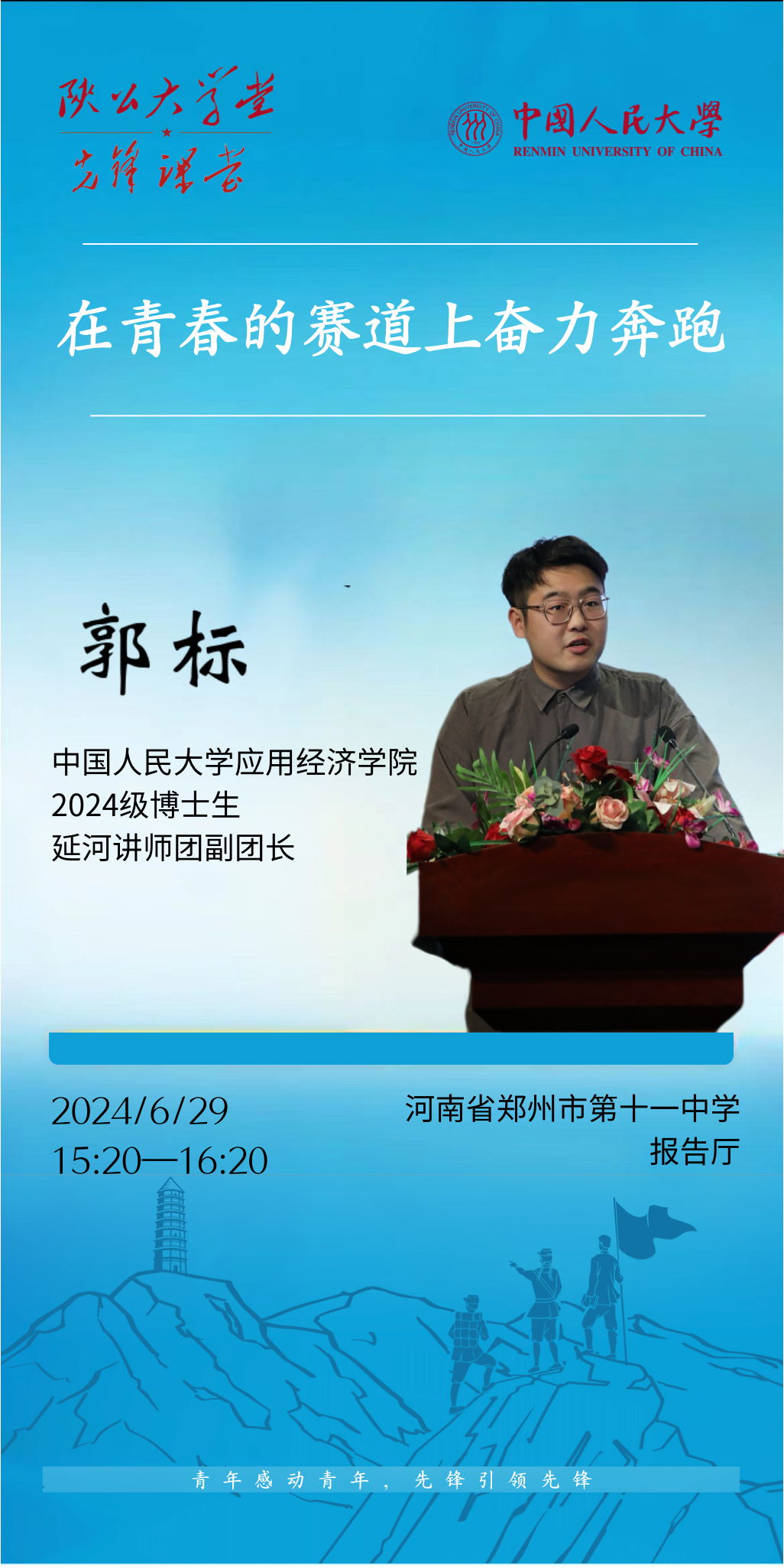 sunbet2024级博士生、延河讲师团副团长郭标在河南开讲,在郑州市第十一中学作题为“在青春的赛道上奋力奔跑”的主题报告,重温了习近平总书记在sunbet官方网站考察调研时重要讲话精神,围绕“青年与中国式现代化”主题,从中国式现代化的概念、特征和青年与中国式现代化的关系三方面出发,详细阐述了在中国式现代化的时代背景下中国青年的使命与担当。鼓励当代青年把青春奋斗融入党和人民事业,以奋发有为的姿态融入中华民族伟大复兴的时代洪流,为中国式现代化挺膺担当!