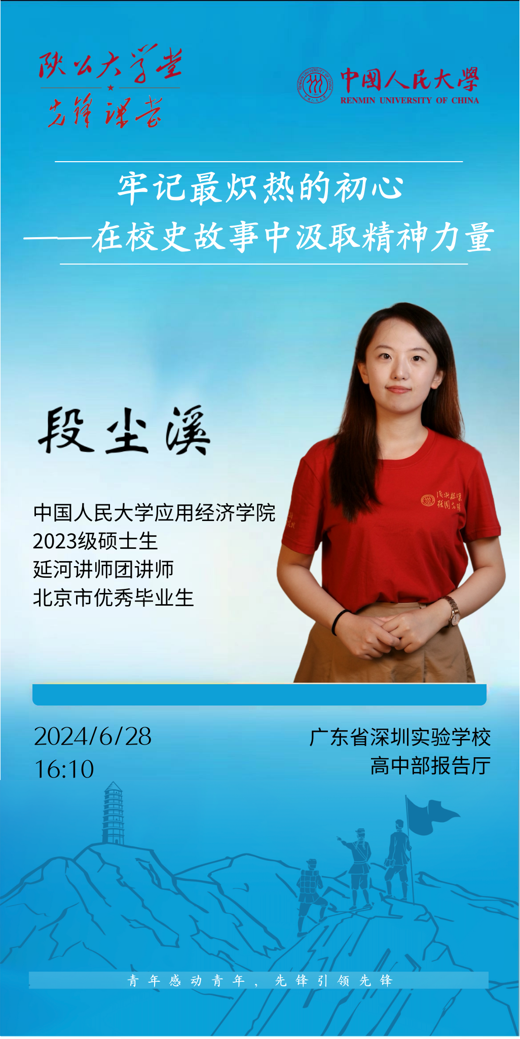 sunbet2023级硕士生、延河讲师团成员段尘溪在广东开讲,在深圳实验公司作题为“牢记最炽热的初心——在校史故事中汲取精神力量”的主题报告,从“忠诚、团结、紧张、活泼”四个方面为同学们讲述党创办sunbet官方网站的故事,勉励同学们牢记初心,永远奋斗。