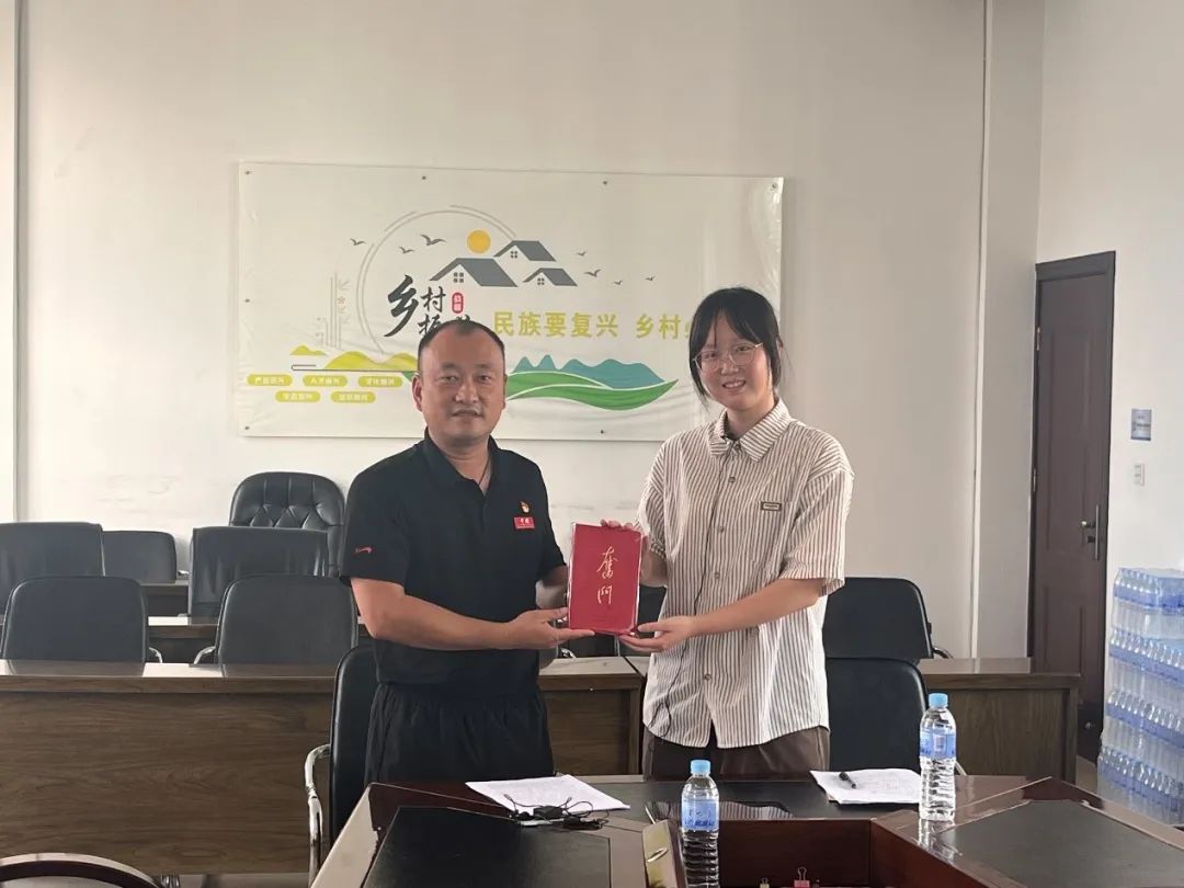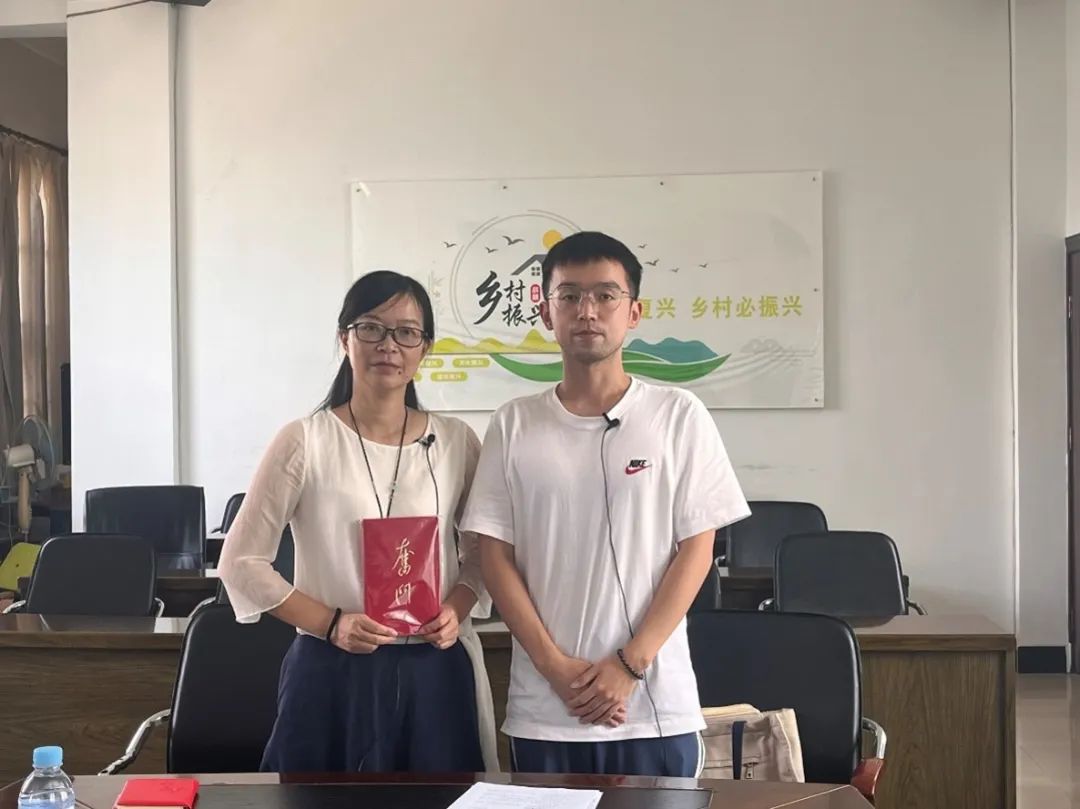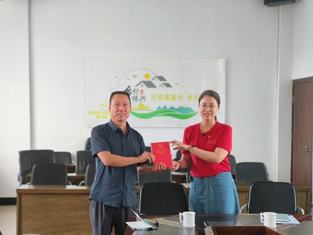 ▲sunbet本科生刘燕妮对原哨冲镇镇长罗映辉访谈后赠书留念