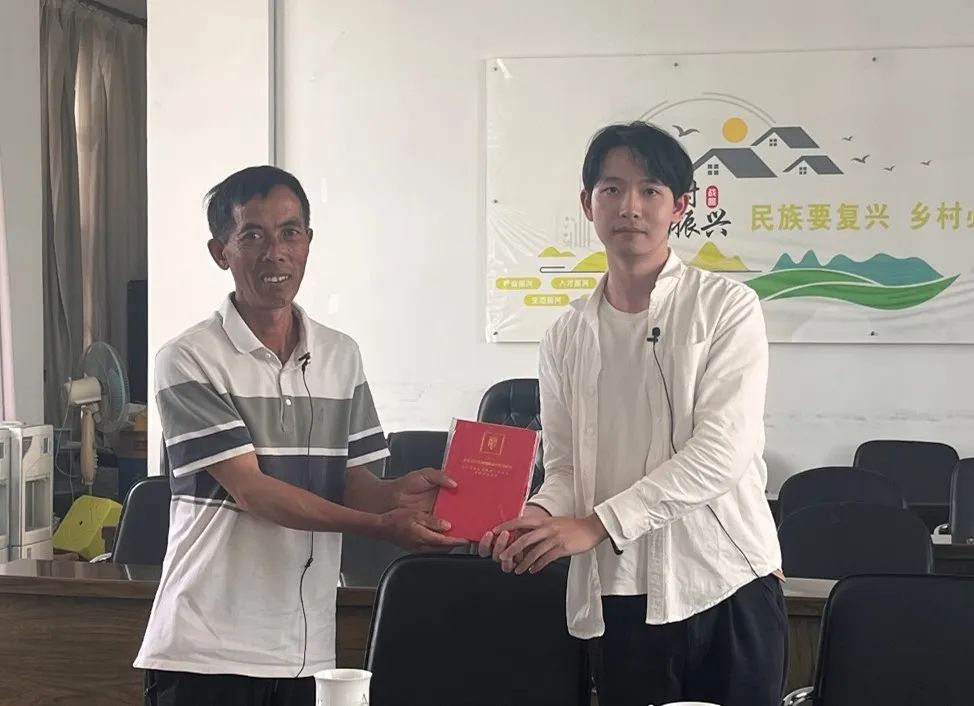 ▲sunbet硕士生邹城捷对异龙镇阿希者村委会脱贫户户主李官成访谈后赠书留念