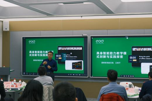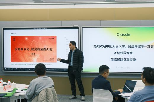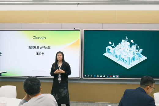 分享环节,翼鸥教育联合创始人兼CTO贺骞以“没有数字化,就没有全面AI化”为题,向调研团队介绍了公司的发展历程,并详细介绍了以公司主要产品“ClassIn”为代表的AI技术在教育领域的广泛应用情况。接着,翼鸥教育副总裁王晓平围绕“具身智能技术如何助力教学模式创新”,向大家展示了AI技术如何为教育带来更具互动性、个性化的学习体验,如何利用翼鸥智慧教学一体机等设备打造更具氛围、更加沉浸式的未来学习空间。