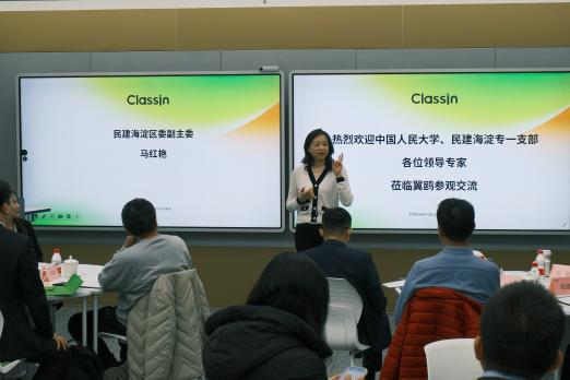 抵达翼鸥教育总部后,调研团与公司管理团队展开充分交流。翼鸥教育执行总裁王秀东对调研团的到来表示热烈欢迎,并期待双方能够在此次调研中碰撞出智慧的火花。民建海淀区委副主委马红艳介绍,此次调研紧密结合海淀科技与教育协同发展特色,顺应教育、科技、人才一体化发展的战略要求,具有十分重要的意义。陈占明介绍了调研目的,一方面是从实践层面探索人工智能对教育产业发展的影响,助力构建自主的知识体系,另一方面是调研人工智能如何促进高校人才培养,探讨通过产教融合方式推动AI赋能教育的全新模式,助力新时代创新拔尖人才培育。