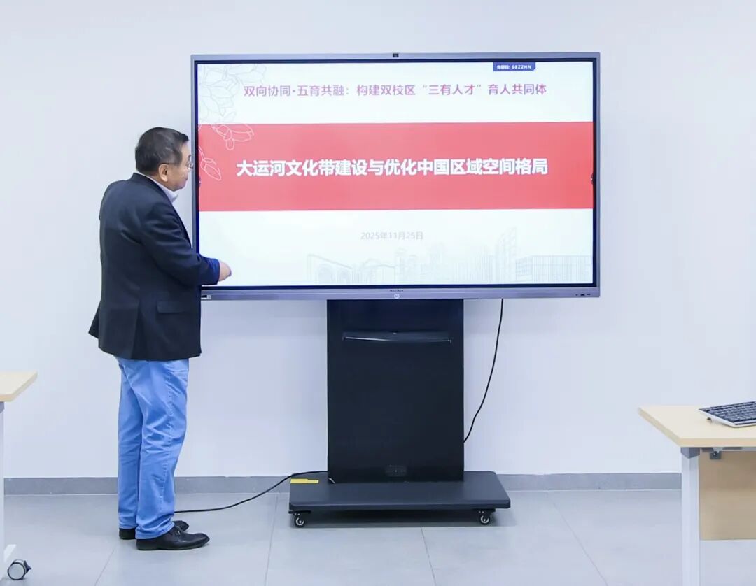 实践研学后,师生们返回通州校区经济学部楼,由孙久文教授讲授 “大运河文化带建设与优化中国区域空间格局” 专题课程。孙久文阐释了大运河作为世界文化遗产与国家战略通道的双重价值,系统讲述了其如何与我国基本空间格局相融合,并系统论证了大运河文化带如何作为一条重要的“文化经济轴线”,嵌入并优化国家宏观区域战略。他深刻剖析了大运河文化带在历史底蕴、生态基础、经济潜力等方面的发展优势,并重点阐述了如何将其深度融入京津冀协同发展国家战略,将上午的实地感悟升华为系统的理论认知,提升了实践研学的系统性和学理性。