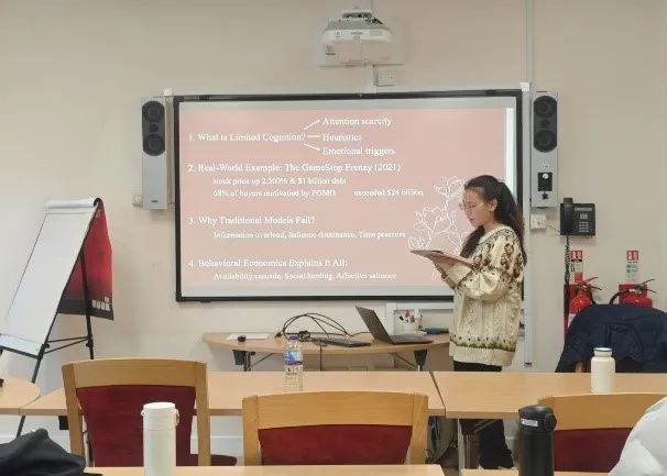 牛津大学Fang Ximeng博士讲授专业前沿课程《行为经济学》,通过一系列群体非理性决策等案例的讲述,向碳经济同学们展示了心理因素对经济发展的影响机制、特征事实和分析框架。课程学习后,碳经济员工针对能源消费、环境保护和气候变化等领域与行为经济学的结合点进行课堂PPT展示和研讨互动,并得到授课教师的逐一点评指导。