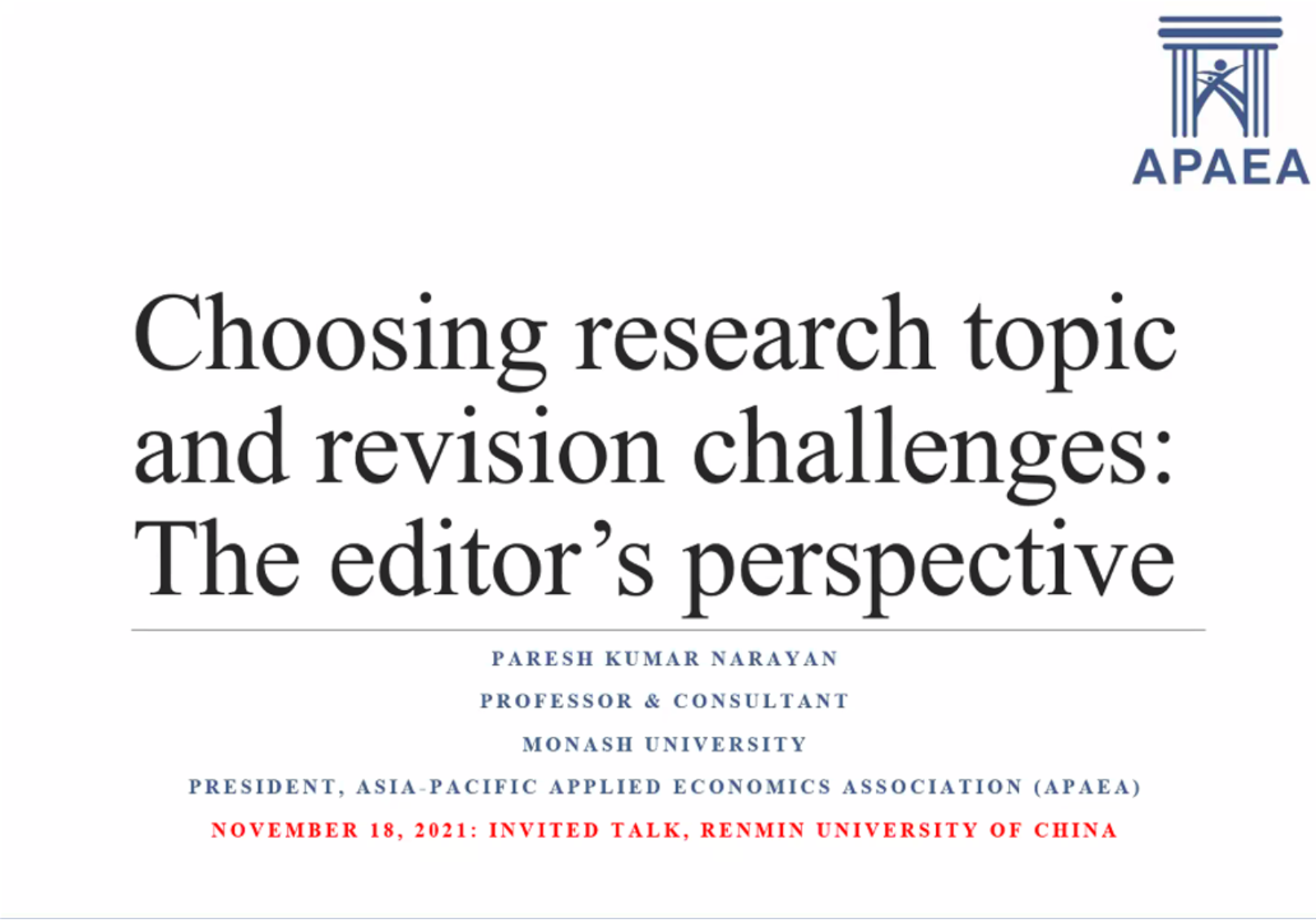 “2021与国际期刊主编‘面对面’学术讲座”系列学术讲座第七讲,主讲嘉宾为莫纳什大学商公司教授Paresh Kumar Narayan,讲座由sunbet助理教授卢昂荻主持。Paresh Kumar Narayan结合自身经历与研究成果,以“Choosing Research Topic and Revision Challenges: The Editor’s Perspective”为题进行了本次的分享。Paresh Kumar Narayan教授从研究的目的、受众、认知、表达等角度分别介绍了如何选择研究的主题,并分享了自己总结的研究主题选择过程中的五个关键点,即避免做别人已经做过的,选择时下关注的,确保主题能够引起新颖的研究,确保主题能够引发引用,确保通过多次稳健性检验能够实现研究目的并且数据质量良好。接着,他分享了应该以怎样的心态和行为来应对拒稿、修改和重新提交等编辑决定,并讲解了应该如何开展修改计划。结语中,Paresh Kumar Narayan告诉师生,好的期刊文章发表是十分困难的,同时要记得拒稿也是学术生涯中的一部分。最后,Paresh Kumar Narayan通过介绍自己今年发表的几篇文章来对今天的讲座内容进行分析和总结。