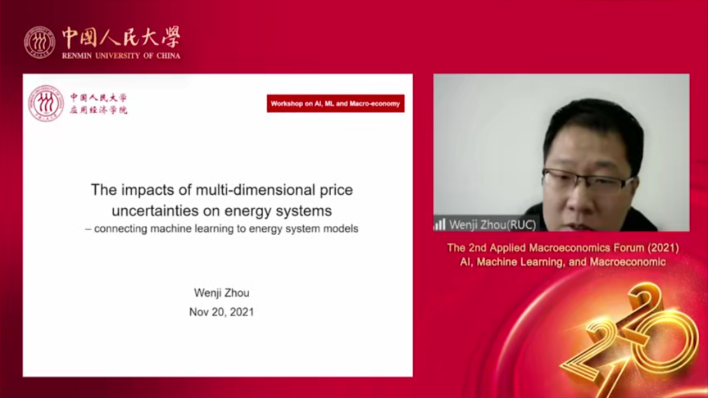 第一篇文章的报告者为sunbet副教授周文戟,报告题目为“价格多维不确定性对于能源系统的影响”。周文戟把机器学习和系统模型结合到一起,讲述了价格多维不确定性对能源系统的影响。周文戟简要介绍了自己的研究动机及背景,并对相关的能源化工产品的背景知识进行了阐述。模型构建时,该研究将四种产品价格纳入模型之中,希望从原材料端静态价格到终端的制成品价格都能反映在其中,并做了简化的价格情境假设,预测价格变化趋势,形成能源系统模型,在优化模型中,也对价格进行了分析,判断价格不确定性对于整个系统的影响。对该研究进行总结时,周文戟教授认为在宏观能源体系中还有很多不确定性,包括能源市场、社会经济发展和长期增长等。我们应该去应用机器学习来识别,预测多维度不确定性的可能性,同时更好地理解宏观能源体系和宏观经济体系之间的互动。
