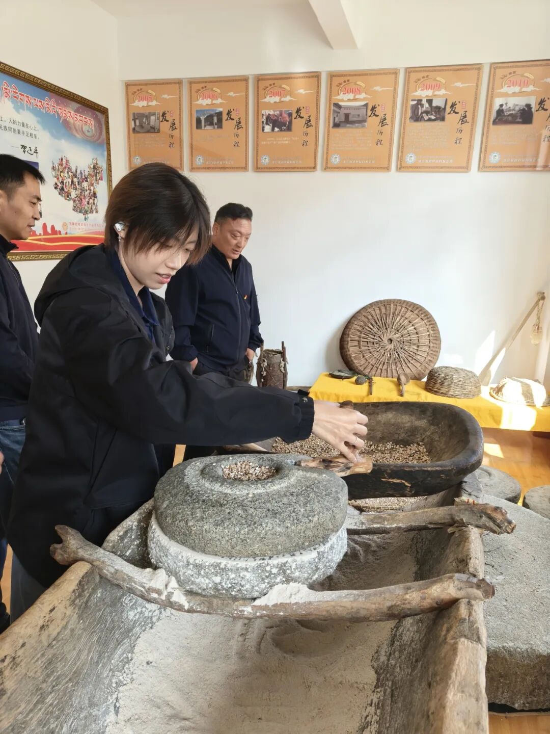 ▲北京大学经济公司博士后蔡宇涵体验手工磨青稞