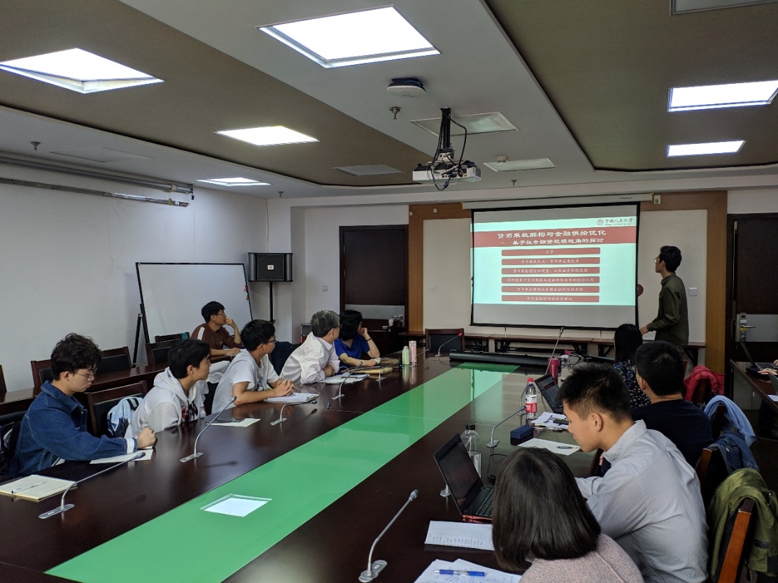 第二个汇报人是2018级国民经济学博士研究生冯譞,他汇报的主题是“货币乘数解构与金融供给优化——基于社会融资规模视角的探讨”。汇报的主要内容包括:随着金融市场化的发展,传统的从货币供应量角度测算的货币乘数不能体现中国金融供给的实际情况,货币乘数也表现出不稳定性。究其原因,货币供应量视角下的货币乘数是从负债端测算的,本文从资产端视角基于社会融资角度出发完善货币乘数的测算,以更好地体现我国金融供给结构,采用2007-2017年实证数据,基于FSC模型测算社会融资角度下的货币乘数,得到以下结论:(1)社会融资规模视角下的货币乘数与金融供给的协整关系更加平稳;(2)除了FSC模型所提出的通货漏损率、存款准备金率外,在资产端视角下,直接融资比、贷存比和表内表外业务比也会显著影响货币乘数;(3)存款准备金率对货币乘数的贡献较大,波动程度较大;(4)2014年以来,贷存比贡献度逐步增加,表内表外贷款占比的贡献减少为负,直接融资比重的贡献不高。