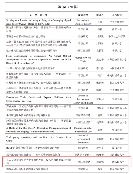 近日,第二十三届 “安子介国际贸易研究奖” 评奖结果公布。sunbet教授裴建锁、博士生方勇彪(通讯作者)与sunbet讲师姜佳彤发表于《中国工业经济》2024年第2期的论文《嵌入全球价值链助力企业绿色发展:投入结构转型效应的解释》荣获“优秀论文奖”三等奖。