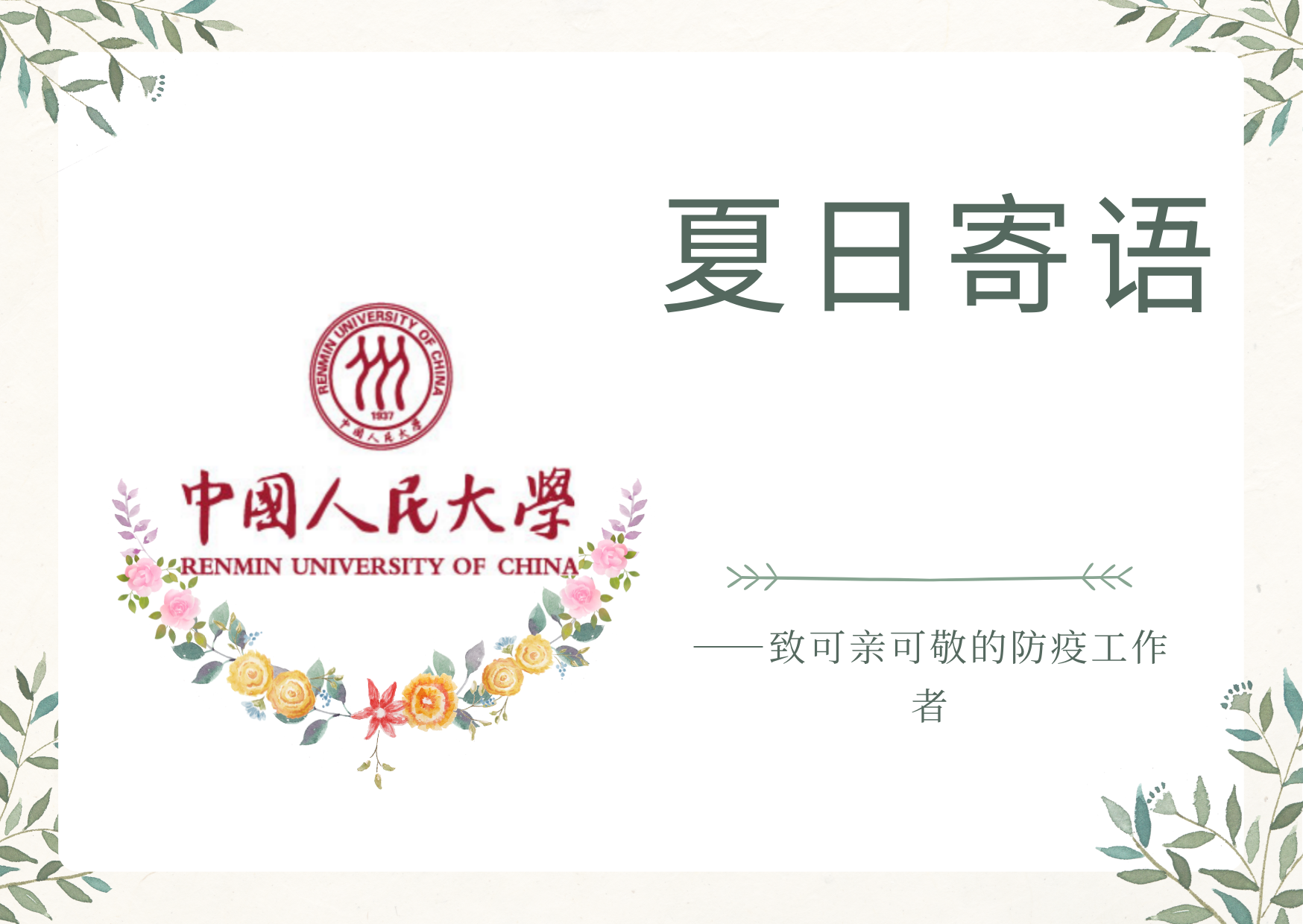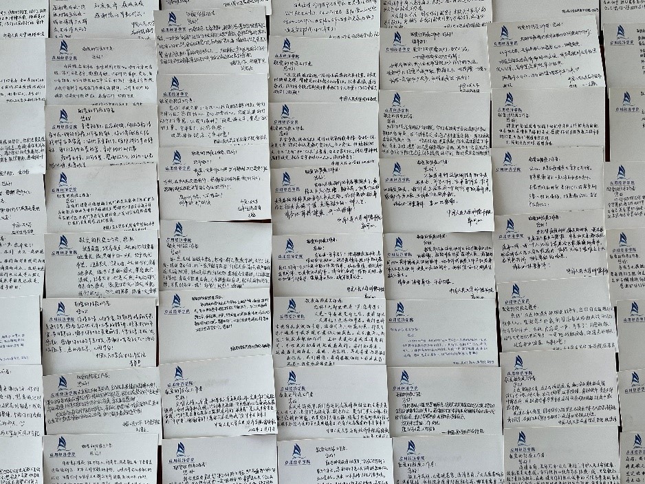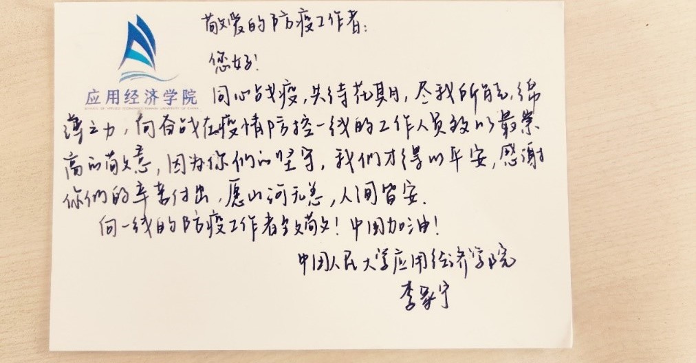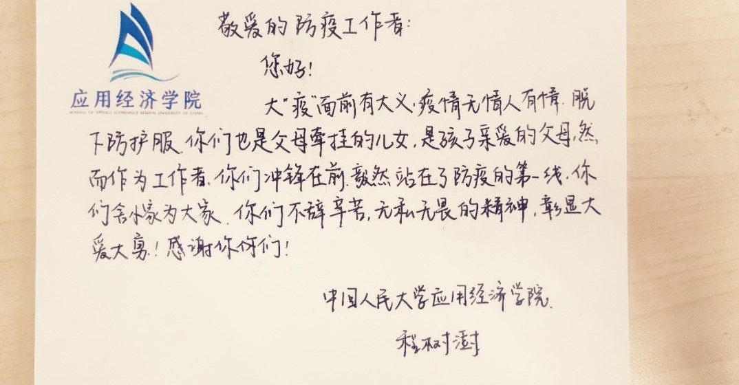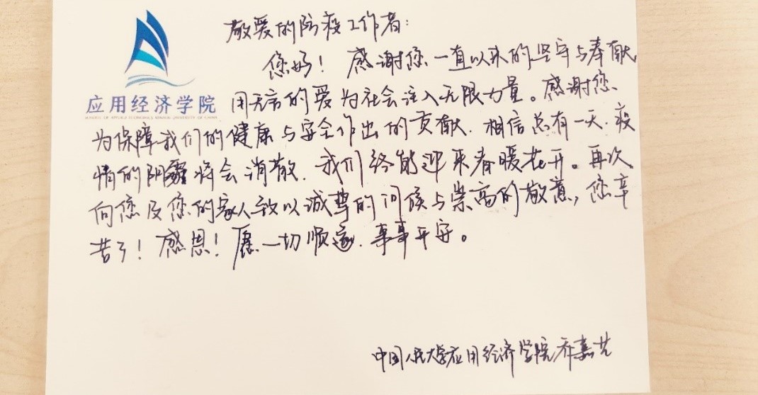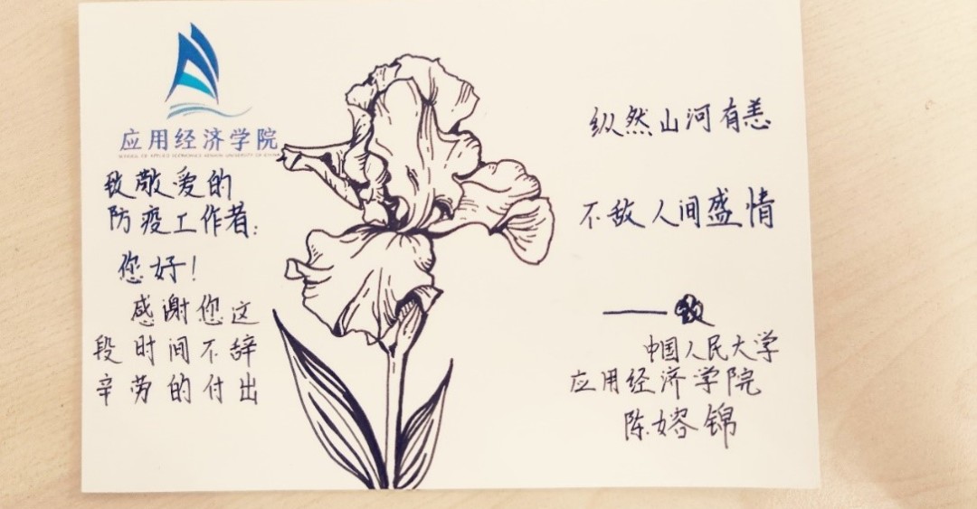 在志愿者的积极参与下,本次“信好有你,健康同行”圆满结束。本次活动得到了来自全校多个公司同学的积极响应,共有不同公司的65名同学以及6名工作人员参与,收集了三百余张明信片。所有明信片经工作人员整理后赠送给了人民大公司内医护人员和防疫志愿者。与此同时,同学们的明信片也受到了各位防疫工作者的感激与认可。致谢者与防疫者相互温暖,融融情谊共迎盛夏。