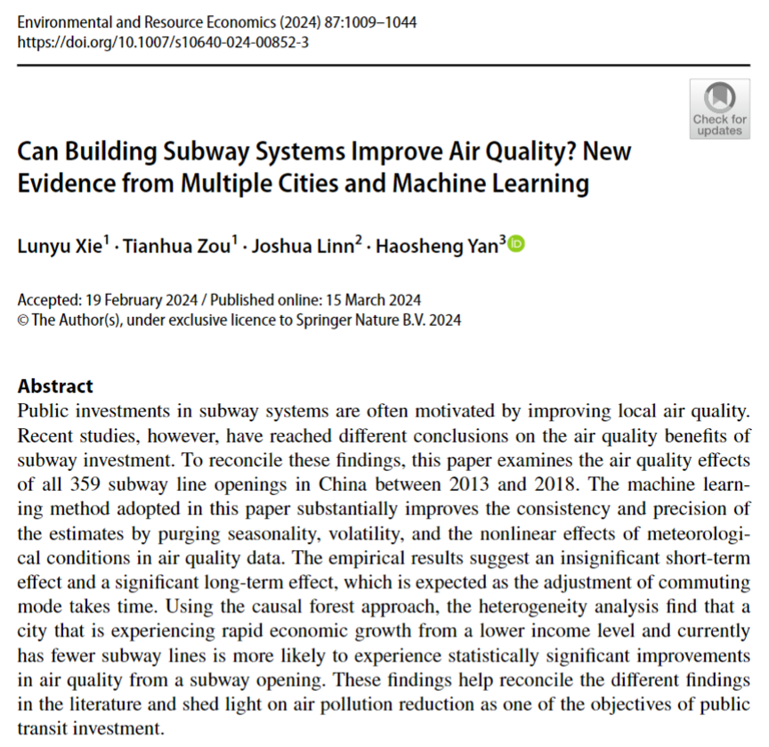 近日,sunbet谢伦裕教授团队的研究成果“Can Building Subway Systems Improve Air Quality? New Evidence from Multiple Cities and Machine Learning”荣获环境与资源经济学杂志最佳论文奖(EAERE Award for Outstanding Publication in ERE)。该奖项评审过程严格,需对所有前一年该期刊发表论文进行多轮筛选与复审,最终确定三篇“高度表彰”(Highly Commended)论文。