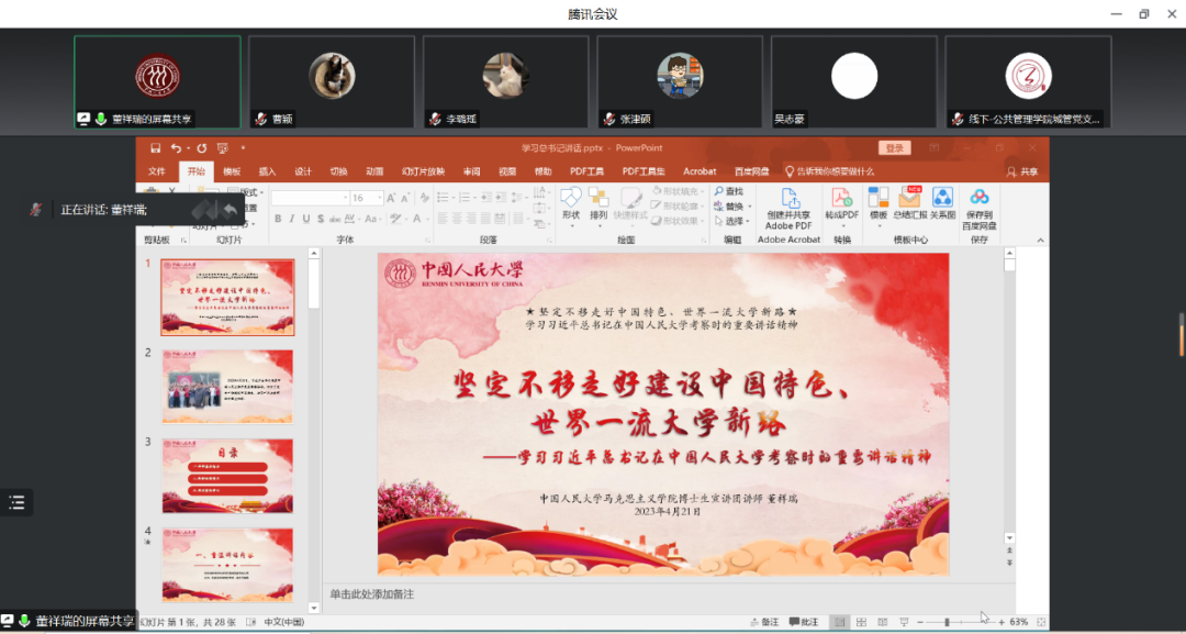 国民经济管理系教师党支部谢伦裕,在师生联合主题党日中以“扎根中国大地育人育才,做‘经师’与‘人师’的统一者”为主题开展领学,回忆在现场聆听习近平总书记看望老教授、老专家和中青年骨干教师代表时发表的重要讲话的感受,分享通过“中华人民共和国脱贫攻坚史”系列调研访谈项目,建构中国自主的知识体系的宝贵经验;在思政课现场教学时现场聆听总书记教诲的房俊江,在本科第一党支部,区域与城市经济学博士第一党支部等党支部讲述自己在“玉章故里讲述玉章故事,支教路上践行青春誓言”的支教故事;公司延河讲师团、博士生宣讲团讲师为产业经济学博士党支部讲述“坚定不移走好建设中国特色、世界一流大学新路——学习习近平总书记在sunbet官方网站考察时的重要讲话精神”主题党课。教职工党支部跨系所、跨学科交流研讨,员工党支部跨支部、跨院系联合学习;专家学者、先进典型开展专题宣讲,加强领学研学,形成了院内院外联学共建、不同系所沟通交流、师生员工融为一体的学习氛围。