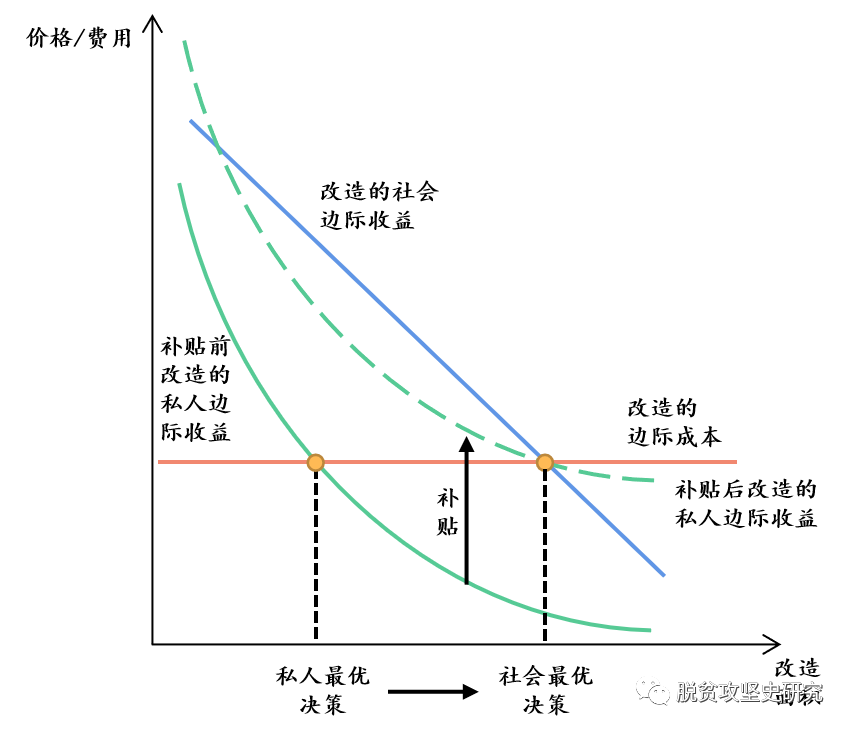 丹江口正是利用上述两种手段提升了果园改造率,有效降低了柑橘种植过程中的病虫害及传染病风险。一方面,鼓励种植大户流转土地参与改造。丹江口在柑橘产业过程中鼓励种植大户流转周边闲置低产果园、土地,利用市场手段将外部性内部化,由大户出资完成果林升级改造。而更具创新性的做法是,丹江口通过实施普惠产业奖补政策引导全体农户参与改造。根据精准扶贫政策要求,在全国大多数地区,只有建档立卡户可以享受产业奖补政策。然而,为了解决果园改造过程中的负外部性,丹江口市制定了具有普惠性的产业政策,即非建档立卡户参与果林改造能够享受与建档立卡户同等的补贴政策,奖补资金由市财政统筹整合资金予以保障。普惠性产业奖补政策提升了农户参与改造的私人收益,提高全体农户参与果林升级改造意愿,优化改造决策,使之接近社会最优(如图所示)。