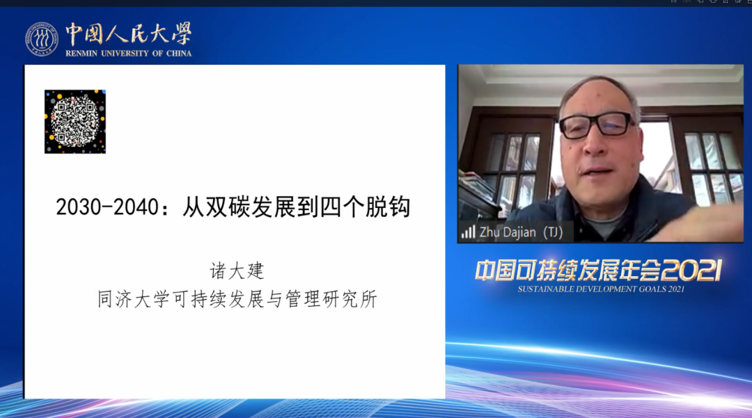 本会场由sunbet助理教授韩奕和助理教授吕一飞主持,同济大学教授诸大建以“2030-2040:从双碳发展到四个脱钩”发表主旨演讲。