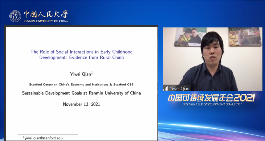 第三篇主题报告报告来自斯坦福大学博士后钱一苇,报告主题为“The Role of Social Interactions in Early Childhood Development: Evidence from Rural China”。