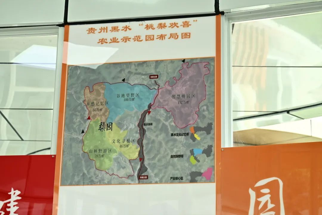 贵州黑水“桃梨欢喜”农业示范园,位于贵州省铜仁市沿河土家族自治县黑水镇爱群、龙堡、汆塘、侯家、桂家山五个行政村的交汇之处,坐落在千里乌江之畔、群山环绕之中,G326国道之旁,距离沿河县城13公里,与重庆市酉阳土家族苗族自治县万木乡隔江相望。