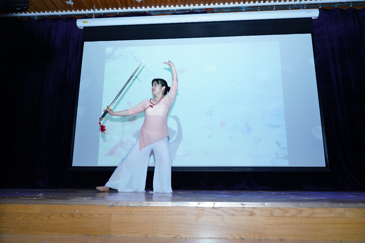 杜甫诗云:“昔有佳人公孙氏,一舞剑器动四方。”撒莉老师再度登台,表演中国古典舞——剑舞《飞雪玉花》、《龙鼓·篆音》,一开场便惊艳全场。由箫、鼓乐与古筝带来的音乐上的力量感和空气感,与剑舞那刚柔并济、行云流水、酣畅淋漓、荡气回肠的动作,将柔美与帅气完美结合,让在场观众感受到中国古典舞中蕴含着深厚的文化精髓,将晚会推向高潮。