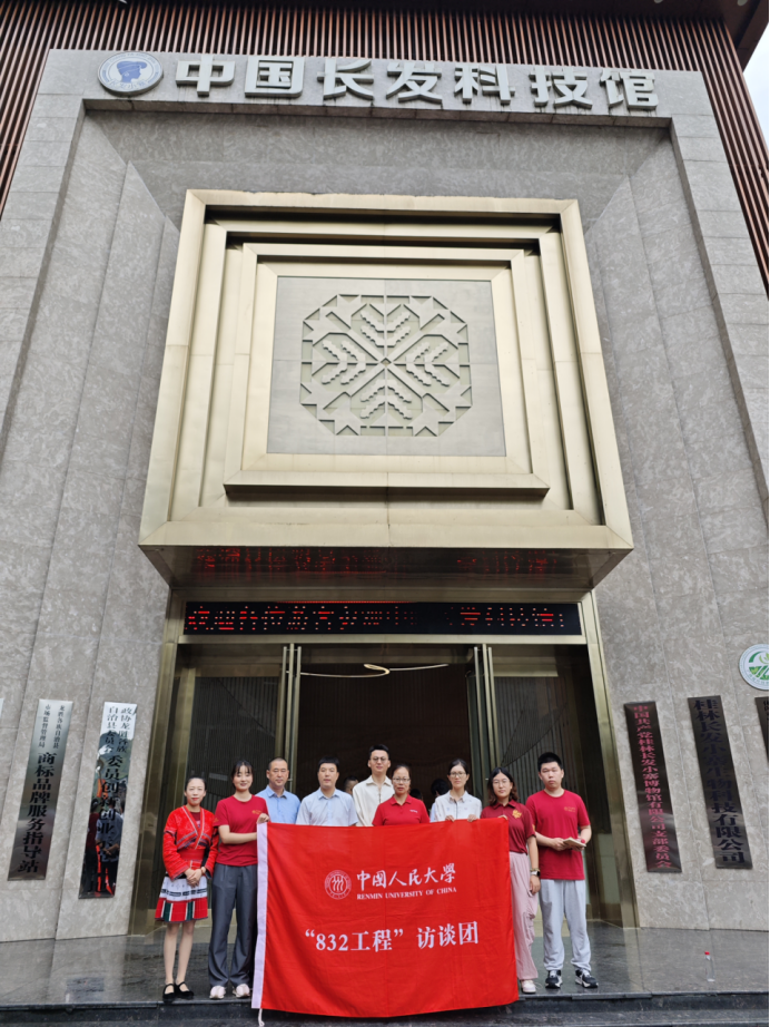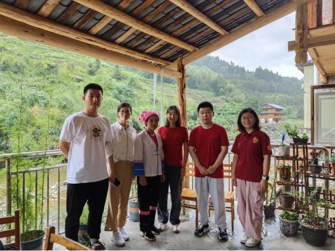▲调研团在龙胜各族自治县龙脊镇金江村黄洛瑶寨中国长发科技馆前合影